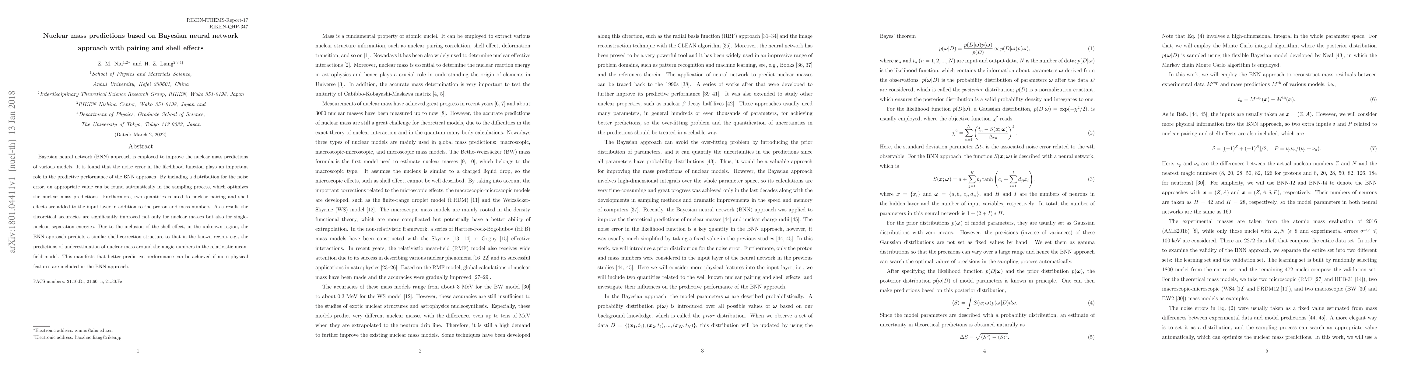 The paper employs a Bayesian neural network (BNN) approach to enhance nuclear mass predictions, finding that noise error in the likelihood function significantly impacts performance. By incorporating a noise error distribution, the BNN optimizes predictions, and adding pairing and shell effect features further improves accuracy for nuclear masses and single-nucleon separation energies.