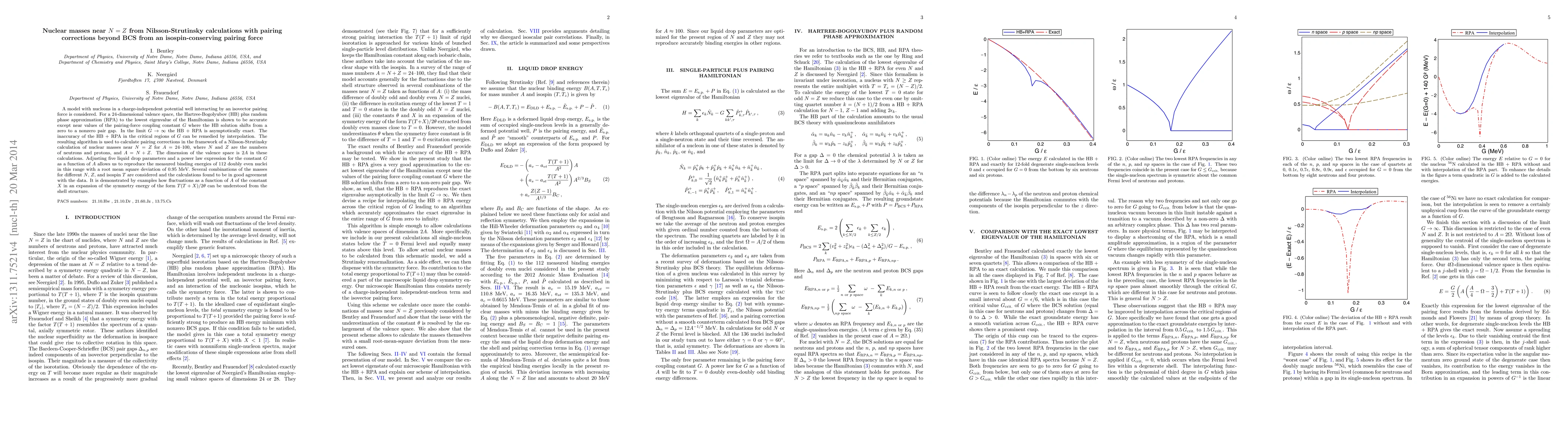 A model with nucleons in a charge-independent potential well interacting by an isovector pairing force is considered. For a 24-dimensional valence space, the Hartree-Bogolyubov (HB) plus random phase approximation (RPA) to the lowest eigenvalue of the Hamiltonian is shown to be accurate except near values of the pairing force coupling constant G where the HB solution shifts from a zero to a non-zero pair gap. In the limit G -> infinity the HB + RPA is asymptotically exact. The inaccuracy of the HB + RPA in the critical regions of G can be remedied by interpolation. The resulting algoritm is used to calculate pairing corrections in the framework of a Nilsson-Strutinsky calculation of nuclear masses near N = Z for A = 24-100, where N and Z are the numbers of neutrons and protons, and A = N + Z. The dimension of the valence space is 2A in these calculations. Adjusting five liquid drop parameters and a power law expression for the constant G as a function of A allows us to reproduce the measured binding energies of 112 doubly even nuclei in this range with a root mean square deviation of 0.95 MeV. Several combinations of the masses for different N, Z, and isospin T are considered and the calculations found to be in good agreement with the data. It is demonstrated by examples how fluctuations as a function of A of the constant X in an expansion of the symmetry energy of the form T(T+X)/(2 theta) can be understood from the shell structure.