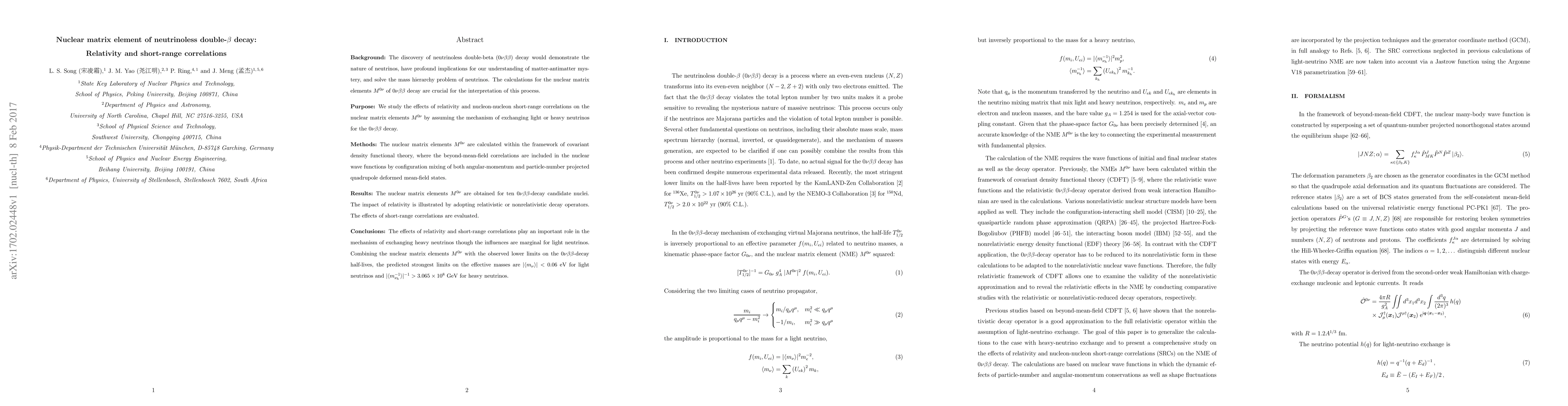 This paper investigates the nuclear matrix elements for neutrinoless double-beta decay ($0\nu\beta\beta$) within covariant density functional theory, focusing on the effects of relativity and nucleon-nucleon short-range correlations. The study finds that these factors significantly impact the decay mechanism involving heavy neutrinos but have a marginal effect on light neutrinos.