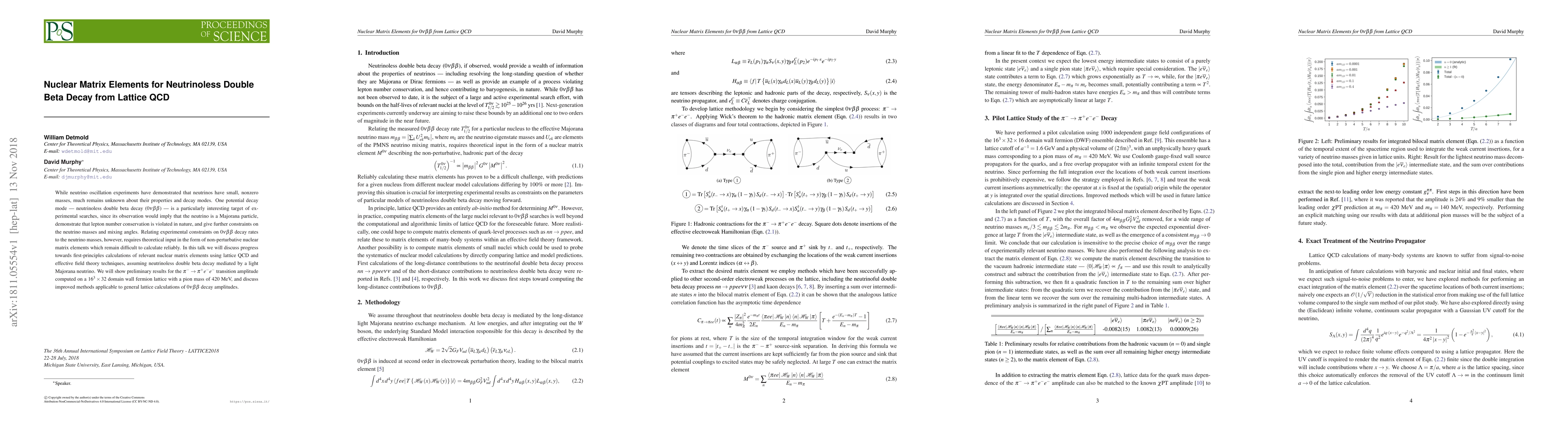 This paper discusses the use of lattice QCD and effective field theory techniques to calculate nuclear matrix elements for neutrinoless double beta decay, a decay mode that would indicate neutrinos are Majorana particles and lepton number violation. Preliminary results from a lattice calculation are presented, showcasing progress towards reliable first-principles computations.