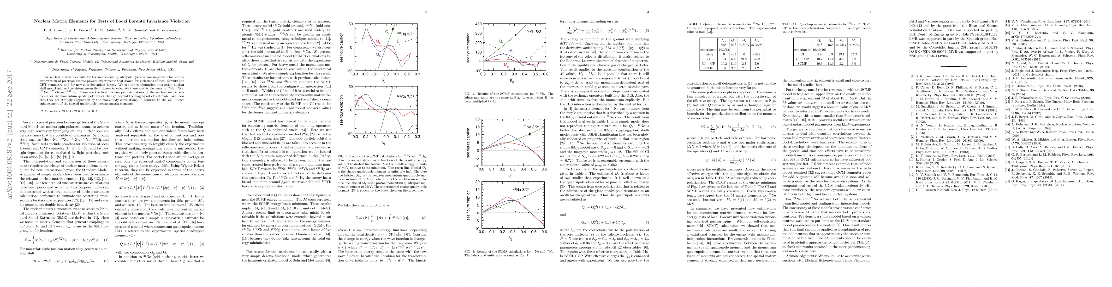 The nuclear matrix elements for the momentum quadrupole operator are important for the interpretation of precision atomic physics experiments that search for violations of local Lorentz and CPT symmetry and for new spin-dependent forces. We use the configuration-interaction nuclear shell model and self-consistent mean field theory to calculate these matrix elements in $^{21}$Ne, $^{23}$Na, $^{131}$Xe, $^{173}$Yb and $^{201}$Hg. These are the first microscopic calculations of the nuclear matrix elements for the momentum quadrupole tensor that go beyond the single-particle estimate. We show that they are strongly suppressed by the many-body correlations, in contrast to the well known enhancement of the spatial quadrupole nuclear matrix elements.