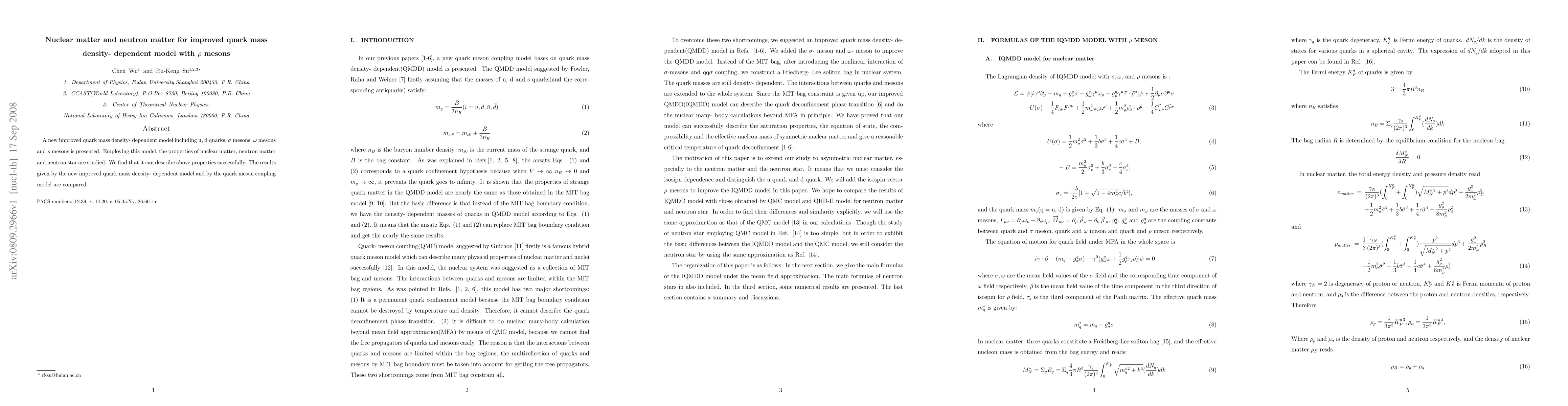 This paper introduces an enhanced quark mass density-dependent model incorporating $\sigma$, $\omega$, and $\rho$ mesons to study nuclear and neutron matter properties, demonstrating successful descriptions of these systems. The new model's results are compared with those from the quark meson coupling model.