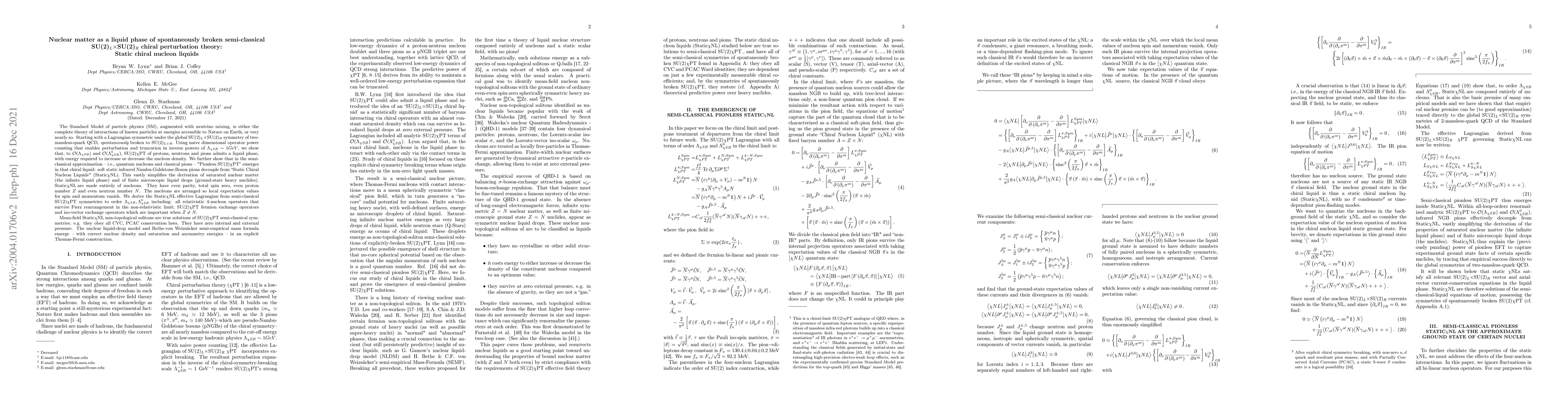 We study effective field theories (EFT) of nuclear structure based on spontaneously broken global $SU(2)_L\times SU(2)_R$ chiral symmetry of QCD with two massless quarks, i.e. $SU(2)\chi PT$. For ground-state nuclei, this EFT enables expansion and truncation in inverse powers of $\Lambda_{\chi SB}\simeq 1 GeV$, with analytic operators renormalized to all loop orders. We derive the EFT Lagrangian to order $\Lambda^0_{\chi SB}$. We show that $SU(2)\chi PT$ of protons, neutrons and pions admits a semi-classical "Static Chiral Nucleon Liquid" (Static$\chi$NL) phase and that "Pion-less" $SU(2)\chi PT$ emerges in this liquid: far-infrared pions decouple from Static$\chi$NL, vastly simplifying the derivation of saturated nuclear matter (the infinite liquid phase) and of finite microscopic liquid drops (ground-state nuclides). Static$\chi$NL are made entirely of nucleons with even parity, total spin zero, and even $Z$ and $N$; local expectation values for spin and momenta vanish. They explain the power of pion-less $SU(2)\chi PT$ to capture experimental ground-state properties of certain nuclides, this explanation following directly from the global symmetries of QCD with two massless quarks. Mean-field Static$\chi$NL non-topological solitons are true solutions of $SU(2)\chi PT$'s semi-classical symmetries: they obey all CVC and PCAC conservation laws and they have zero internal and external pressure. The nuclear liquid-drop model and the semi-empirical mass formula emerge -- with correct nuclear density and saturation and asymmetry energies -- in an explicit Thomas-Fermi construction. We relate our work to compatible and complementary work in pionless and in halo/ cluster EFTs, also composed entirely of nucleons and applied to light ($A\leq 6$) nuclei, which might provide important (<12.5%) corrections to Static$\chi NL$.