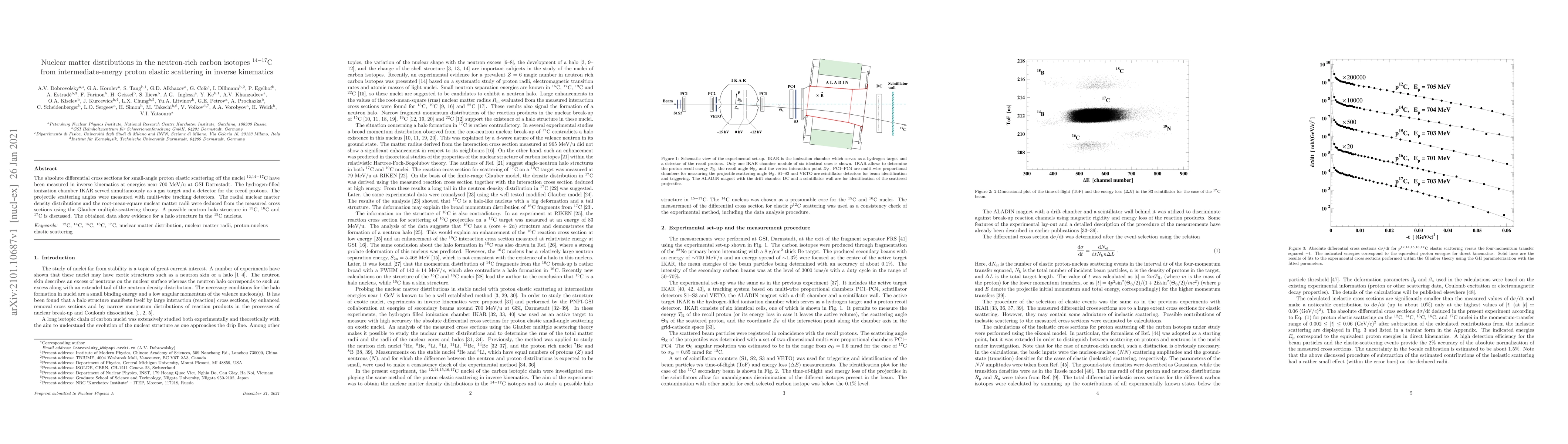 The absolute differential cross sections for small-angle proton elastic scattering off the nuclei $^{12,14-17}$C have been measured in inverse kinematics at energies near 700 MeV/u at GSI Darmstadt. The hydrogen-filled ionization chamber IKAR served simultaneously as a gas target and a detector for the recoil protons. The projectile scattering angles were measured with multi-wire tracking detectors. The radial nuclear matter density distributions and the root-mean-square nuclear matter radii were deduced from the measured cross sections using the Glauber multiple-scattering theory. A possible neutron halo structure in $^{15}$C, $^{16}$C and $^{17}$C is discussed. The obtained data show evidence for a halo structure in the $^{15}$C nucleus.