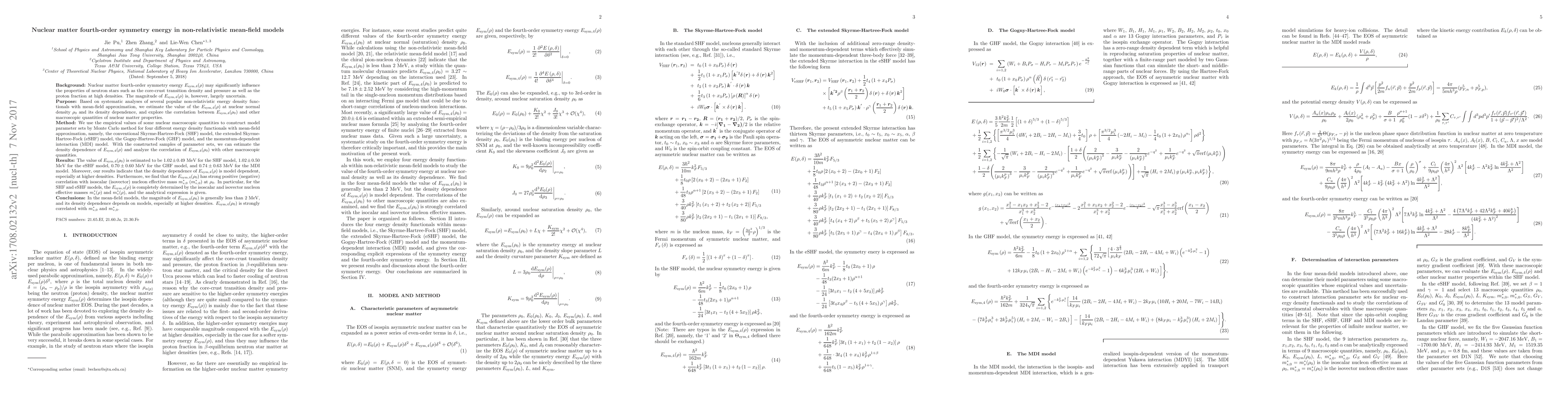 This paper estimates the fourth-order symmetry energy $E_{\text{sym,4}}(\rho)$ in various non-relativistic mean-field models, finding values ranging from $0.70\pm0.60$ MeV to $1.02\pm0.49$ MeV at nuclear normal density. The study reveals that $E_{\text{sym,4}}(\rho)$ is model-dependent and strongly correlated with nucleon effective masses.
