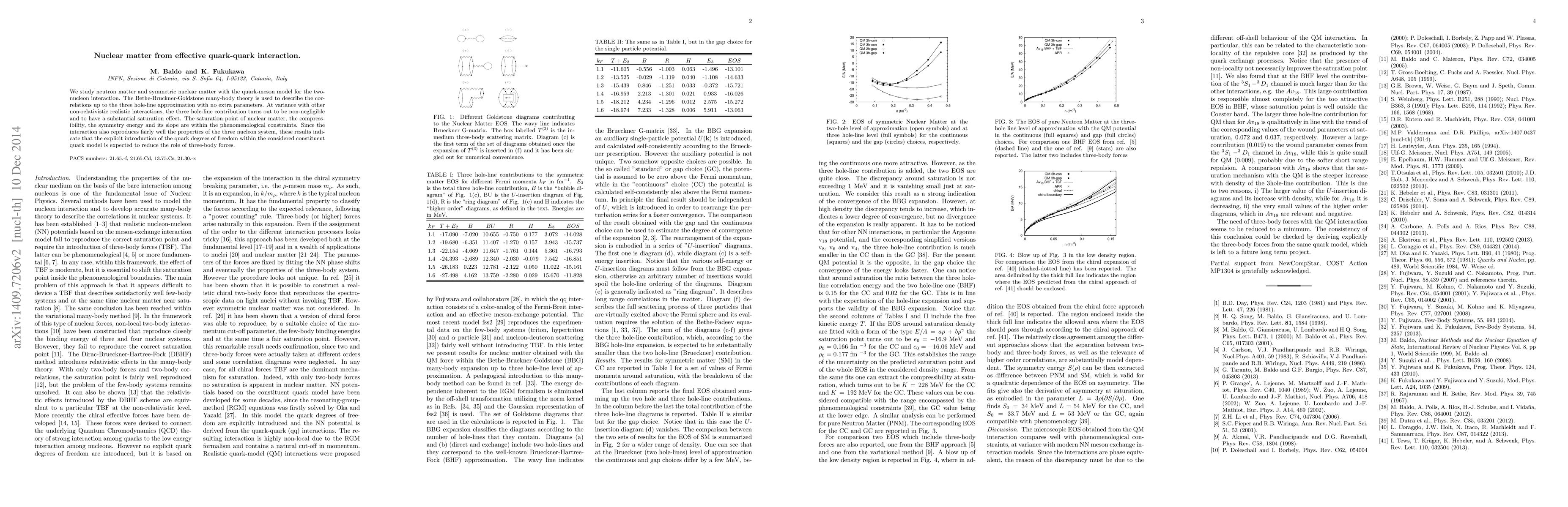 We study neutron matter and symmetric nuclear matter with the quark-meson model for the two-nucleon interaction. The Bethe-Bruckner-Goldstone many-body theory is used to describe the correlations up to the three hole-line approximation with no extra parameters. At variance with other non-relativistic realistic interactions, the three hole-line contribution turns out to be non-negligible and to have a substantial saturation effect. The saturation point of nuclear matter, the compressibility, the symmetry energy and its slope are within the phenomenological constraints. Since the interaction also reproduces fairly well the properties of the three nucleon system, these results indicate that the explicit introduction of the quark degrees of freedom within the considered constituent quark model is expected to reduce the role of three-body forces.