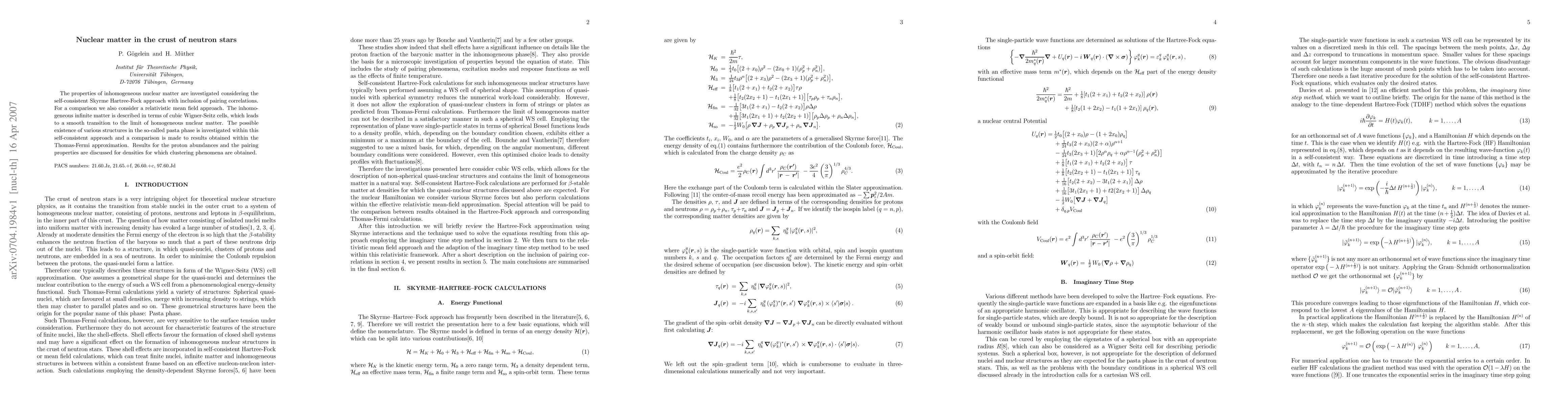 The properties of inhomogeneous nuclear matter are investigated considering the self-consistent Skyrme Hartree-Fock approach with inclusion of pairing correlations. For a comparison we also consider a relativistic mean field approach. The inhomogeneous infinite matter is described in terms of cubic Wigner-Seitz cells, which leads to a smooth transition to the limit of homogeneous nuclear matter. The possible existence of various structures in the so-called pasta phase is investigated within this self-consistent approach and a comparison is made to results obtained within the Thomas-Fermi approximation. Results for the proton abundances and the pairing properties are discussed for densities for which clustering phenomena are obtained.