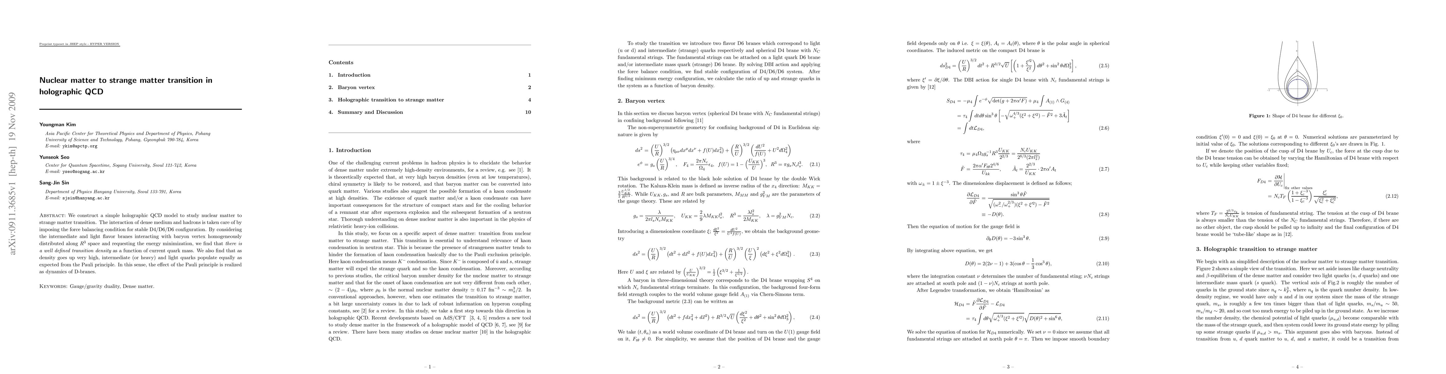 This research constructs a holographic QCD model to explore the nuclear matter to strange matter transition, finding a transition density dependent on current quark mass. High densities cause intermediate and light quarks to equally populate, reflecting the Pauli principle through D-brane dynamics.