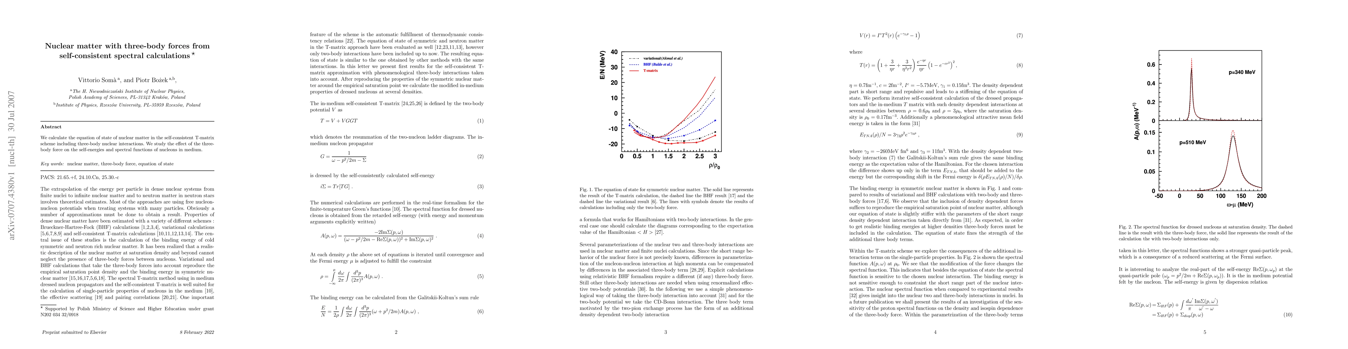 This paper calculates the equation of state for nuclear matter using the self-consistent T-matrix approach, incorporating three-body nuclear forces, and investigates their impact on nucleon self-energies and spectral functions within the medium.