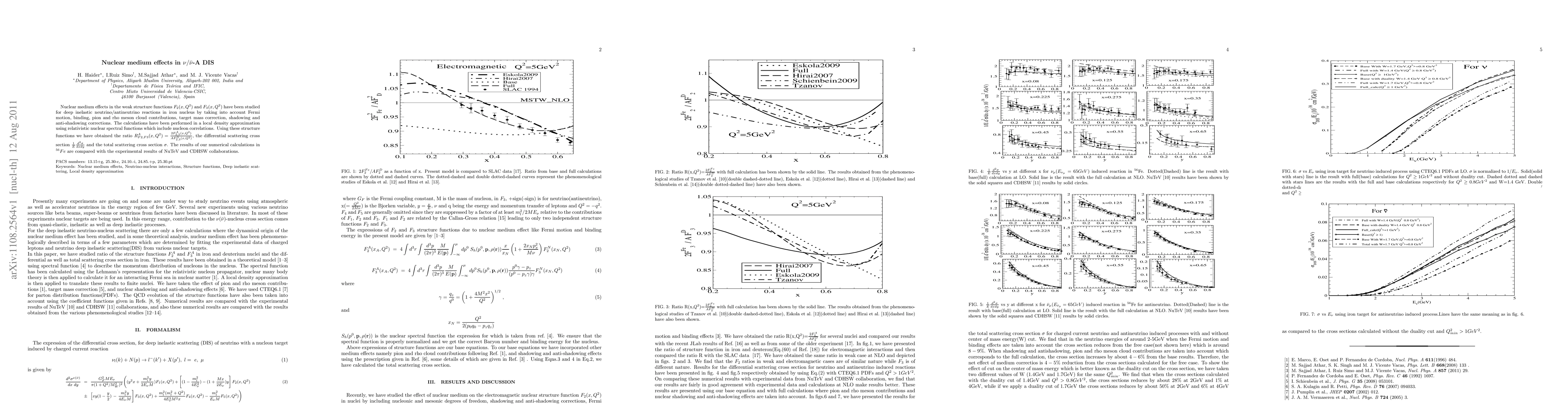 This research investigates nuclear medium effects on weak structure functions in neutrino/antineutrino deep inelastic scattering off an iron nucleus. Utilizing Fermi motion, binding, meson cloud contributions, target mass correction, and shadowing/anti-shadowing, the study calculates structure functions, ratio R, differential and total scattering cross sections. Results are contrasted with NuTeV and CDHSW experimental data, providing insights into nuclear effects in these interactions.