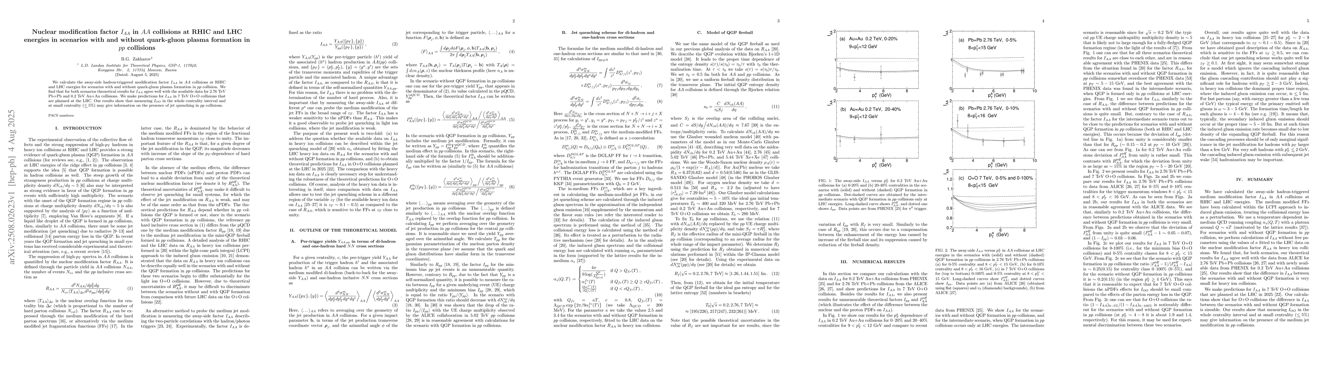 We calculate the away-side hadron-triggered modification factor $I_{AA}$ in $AA$ collisions at RHIC and LHC energies for scenarios with and without quark-gluon plasma formation in $pp$ collision. We find that for both scenarios theoretical results for $I_{AA}$ agree well with the available data for 2.76 TeV Pb+Pb and 0.2 TeV Au+Au collisions. We make predictions for $I_{AA}$ in 7 TeV O+O collisions that are planned at the LHC. Our results show that measuring $I_{OO}$ in the whole centrality interval and at small centrality ($\lesssim 5$%) may give information on the presence of jet quenching in $pp$ collisions.