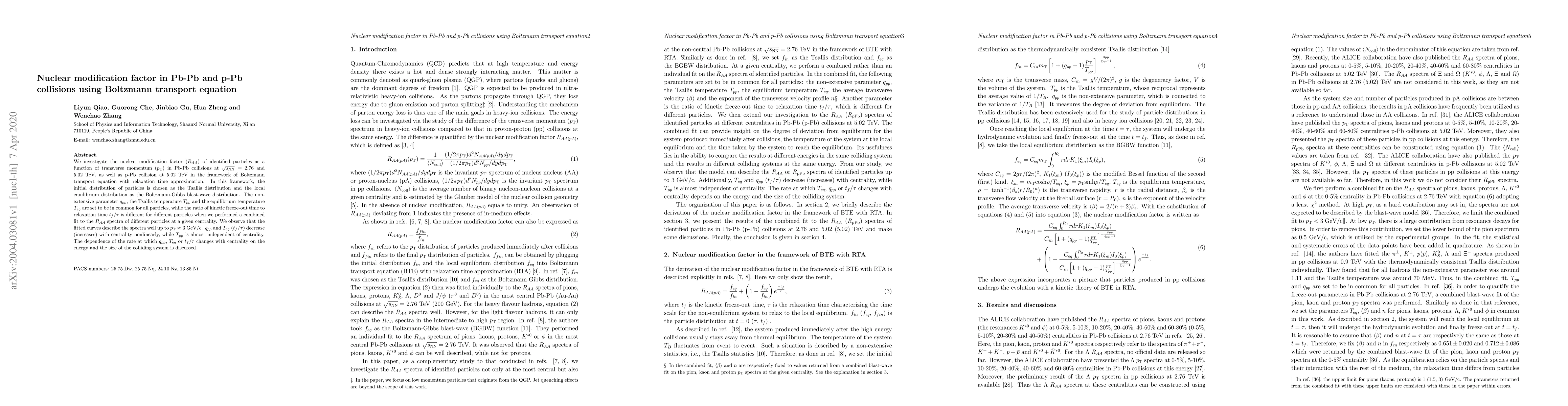 We investigate the nuclear modification factor ($R_{AA}$) of identified particles as a function of transverse momentum ($p_{\rm T}$) in Pb-Pb collisions at $\sqrt{s_{\rm NN}}=$ 2.76 and 5.02 TeV, as well as p-Pb collision at 5.02 TeV in the framework of Boltzmann transport equation with relaxation time approximation. In this framework, the initial distribution of particles is chosen as the Tsallis distribution and the local equilibrium distribution as the Boltzmann-Gibbs blast-wave distribution. The non-extensive parameter $q_{pp}$, the Tsallis temperature $T_{pp}$ and the equilibrium temperature $T_{eq}$ are set to be in common for all particles, while the ratio of kinetic freeze-out time to relaxation time $t_{f}/\tau$ is different for different particles when we performed a combined fit to the $R_{AA}$ spectra of different particles at a given centrality. We observe that the fitted curves describe the spectra well up to $p_{\rm T}\approx$ 3 GeV/c. $q_{pp}$ and $T_{eq}$ ($t_{f}/\tau$) decrease (increases) with centrality nonlinearly, while $T_{pp}$ is almost independent of centrality. The dependence of the rate at which $q_{pp}$, $T_{eq}$ or $t_{f}/\tau$ changes with centrality on the energy and the size of the colliding system is discussed.