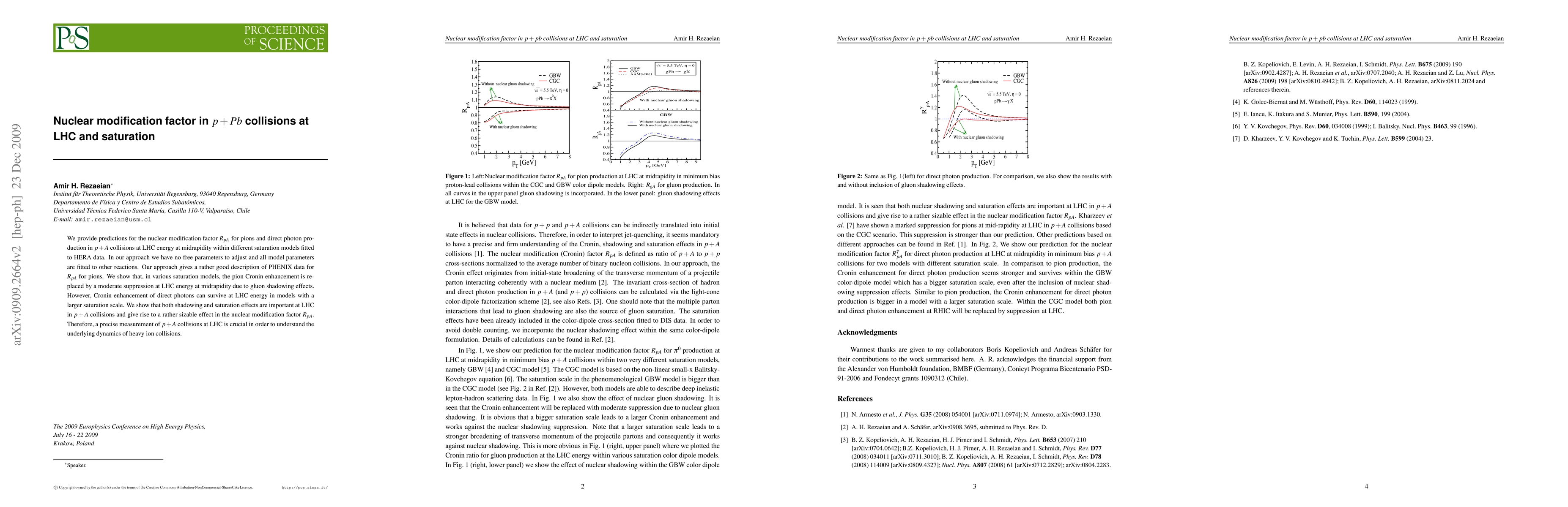 This paper predicts the nuclear modification factor R_{pA} for pions and direct photons in p+A collisions at LHC energy, showing that gluon shadowing leads to moderate suppression of pions while direct photon Cronin enhancement may persist. Accurate measurements are essential to understand the dynamics of heavy ion collisions.