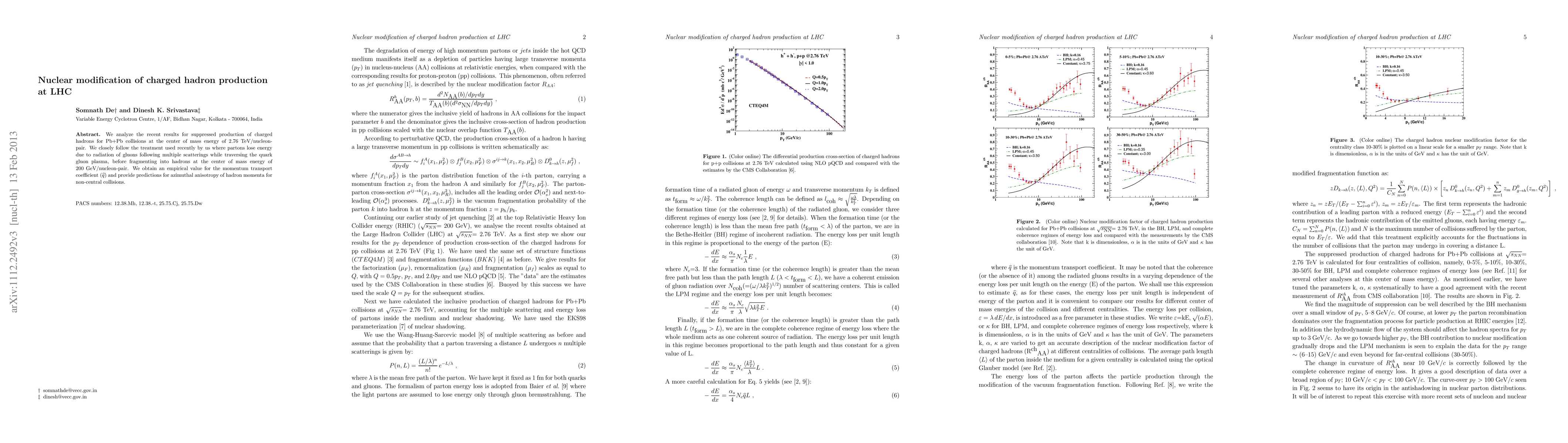 We analyze the recent results for suppressed production of charged hadrons for Pb+Pb collisions at the center of mass energy of 2.76 TeV/nucleon-pair. We closely follow the treatment used recently by us where partons lose energy due to radiation of gluons following multiple scatterings while traversing the quark gluon plasma, before fragmenting into hadrons at the center of mass energy of 200 GeV/nucleon-pair. We obtain an empirical value for the momentum transport coefficient $(\widehat{q})$ and provide predictions for azimuthal anisotropy of hadron momenta for non-central collisions.