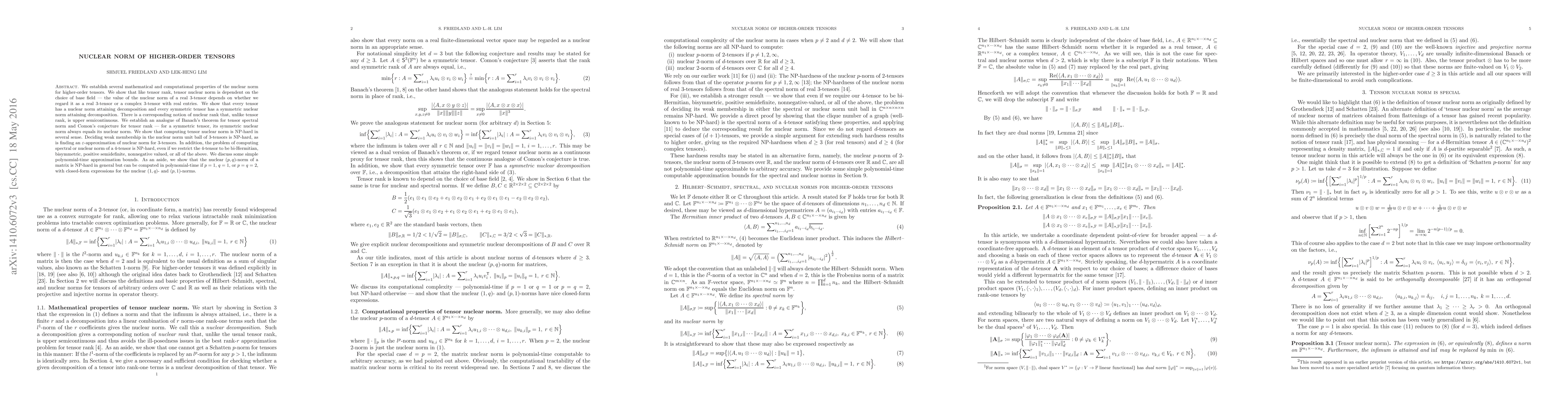 The paper introduces and proves properties of the nuclear norm for higher-order tensors, including its dependence on the base field, nuclear rank, and various decomposition theorems, establishing its NP-hardness for certain computational problems.