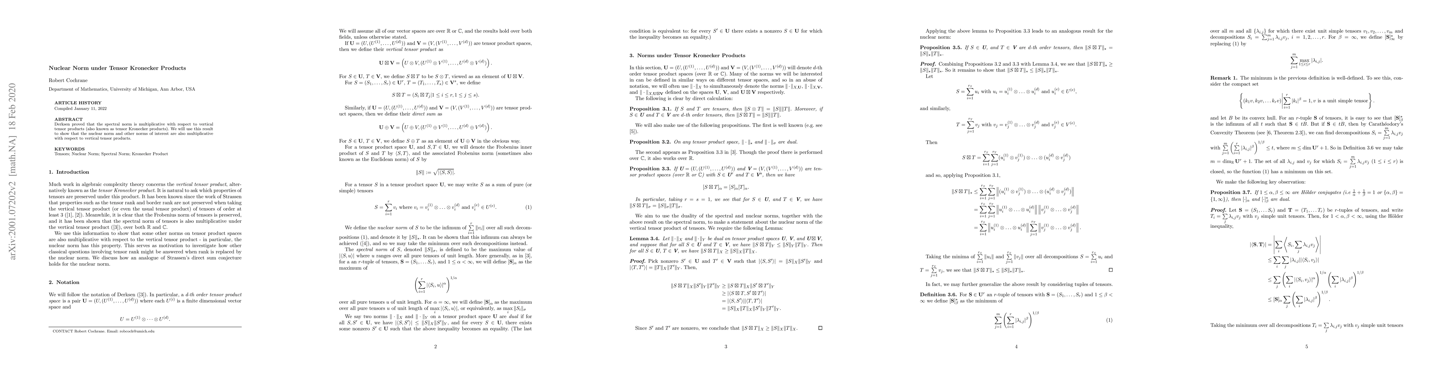 Summary: This paper extends Derksen's result on the multiplicative property of the spectral norm to vertical tensor products, demonstrating that the nuclear norm and other relevant norms also exhibit multiplicative behavior under these tensor Kronecker products.