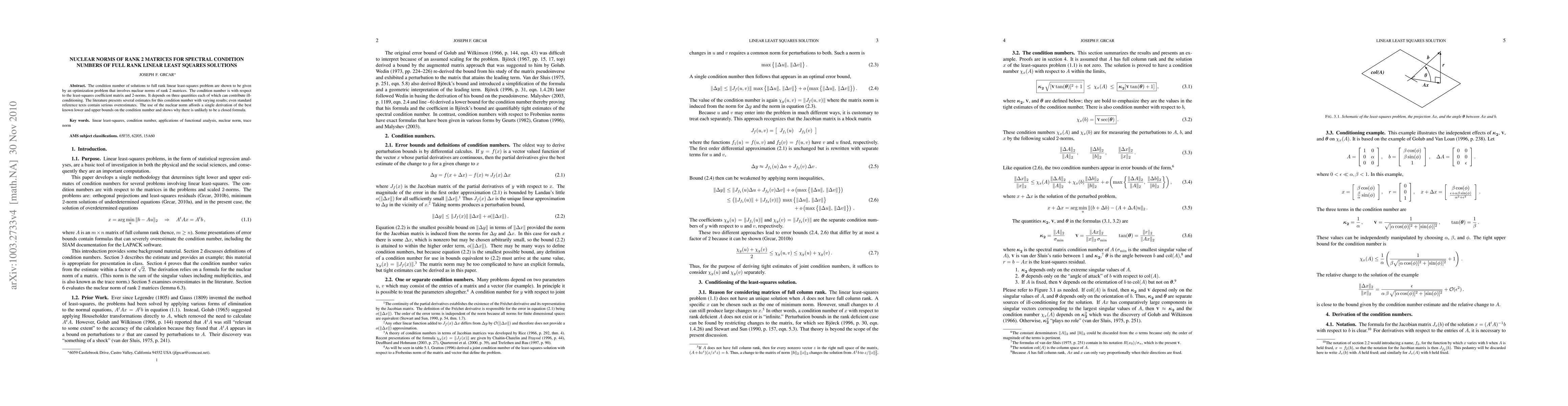 This paper demonstrates that the spectral condition number for full rank linear least-squares solutions can be derived through an optimization problem involving the nuclear norms of rank 2 matrices. The analysis reveals that the condition number is influenced by three quantities, and the use of nuclear norms provides the best known bounds, highlighting the absence of a closed formula.