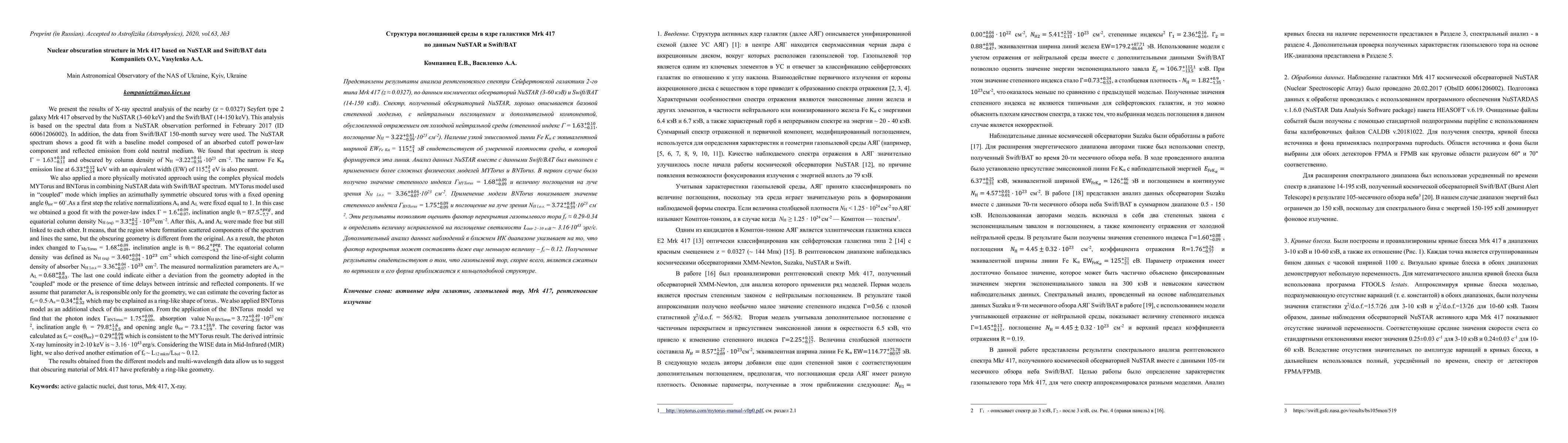 We present the results of X-ray spectral analysis of the Seyfert type 2 galaxy Mrk 417 observed by the NuSTAR (3-60 keV) and the Swift/BAT (14-150) observatories. The NuSTAR data shows a good fit with a baseline model which composed of an absorbed cutoff power-law component and reflected emission from the cold neutral medium. We found that the spectrum is steep $\Gamma = 1.63_{-0.11}^{+0.10}$ and obscured by hydrogen column density of $N_{H} = 3.22_{-0.39}^{+0.41} \cdot 10^{23} cm^{-2}$, narrow $FeK_\alpha$ emission line has an equivalent width of $EW = 115_{-1}^{+2}$ eV that suggests this feature is originated in a moderate density of obscurer. In combining NuSTAR data with Swift/BAT spectrum we also applied a more physically motivated approach using complex physical models MYTorus and BNTorus. For the first case the photon index of $\Gamma_{MYTorus} = 1.68_{-0.09}^{+0.09}$ and the line-of-sight column density of the absorber $N_{H,l.o.s} = 3.36_{-0.07}^{+0.04} \cdot 10^{23} cm^{-2}$. Applying BNTorus model shows the photon index $\Gamma_{BNTorus} = 1.75_{-0.09}^{+0.09}$ and absorption $N_{H,l.o.s} = 3.72_{-0.39}^{+0.49} \cdot 10^{23} cm^{-2}$. Based on the results we get an estimation of gas-dust torus covering factor $f_{c} = 0.29-0.34$ and an intrinsic X-ray luminosity in 2-10 keV of $\approx 3.16\cdot 10^{43}$ erg/s. Further analysis of Mid-Infrared (MIR) observational data, indicates that the covering factor maybe even smaller $f_{c} \approx 0.12$. Our results allow us to suggest that obscuring material of Mrk 417 has preferably a ring-like geometry.
