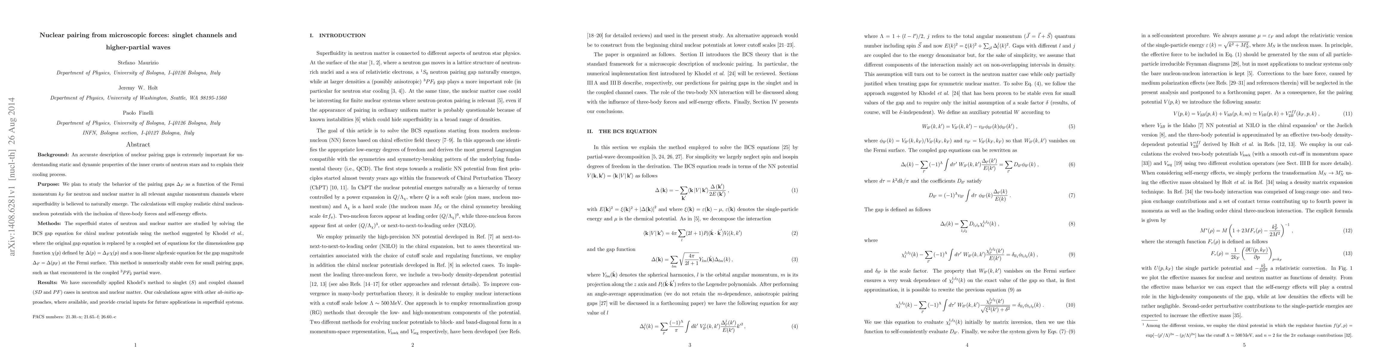 Background: An accurate description of nuclear pairing gaps is extremely important for understanding static and dynamic properties of the inner crusts of neutron stars and to explain their cooling process. Purpose: We plan to study the behavior of the pairing gaps $\Delta_F$ as a function of the Fermi momentum $k_F$ for neutron and nuclear matter in all relevant angular momentum channels where superfluidity is believed to naturally emerge. The calculations will employ realistic chiral nucleon-nucleon potentials with the inclusion of three-body forces and self-energy effects. Methods: The superfluid states of neutron and nuclear matter are studied by solving the BCS gap equation for chiral nuclear potentials using the method suggested by Khodel et al., where the original gap equation is replaced by a coupled set of equations for the dimensionless gap function $\chi(p)$ defined by $\Delta(p) = \Delta_F \chi(p)$ and a non-linear algebraic equation for the gap magnitude $\Delta_F = \Delta(p_F)$ at the Fermi surface. This method is numerically stable even for small pairing gaps, such as that encountered in the coupled $^3PF_2$ partial wave. Results: We have successfully applied Khodel's method to singlet ($S$) and coupled channel ($SD$ and $PF$) cases in neutron and nuclear matter. Our calculations agree with other ab-initio approaches, where available, and provide crucial inputs for future applications in superfluid systems.
