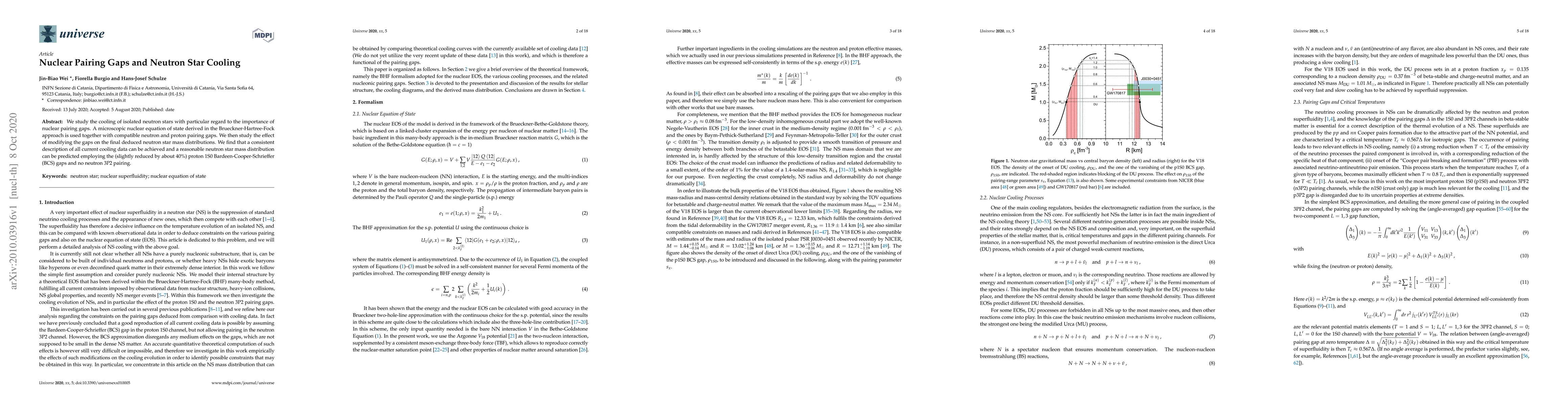 This paper investigates neutron star cooling with a focus on nuclear pairing gaps, using a microscopic nuclear equation of state derived from the Brueckner-Hartree-Fock approach. It finds that employing slightly reduced proton BCS gaps and no neutron pairing can consistently describe current cooling data and predict a reasonable neutron star mass distribution.