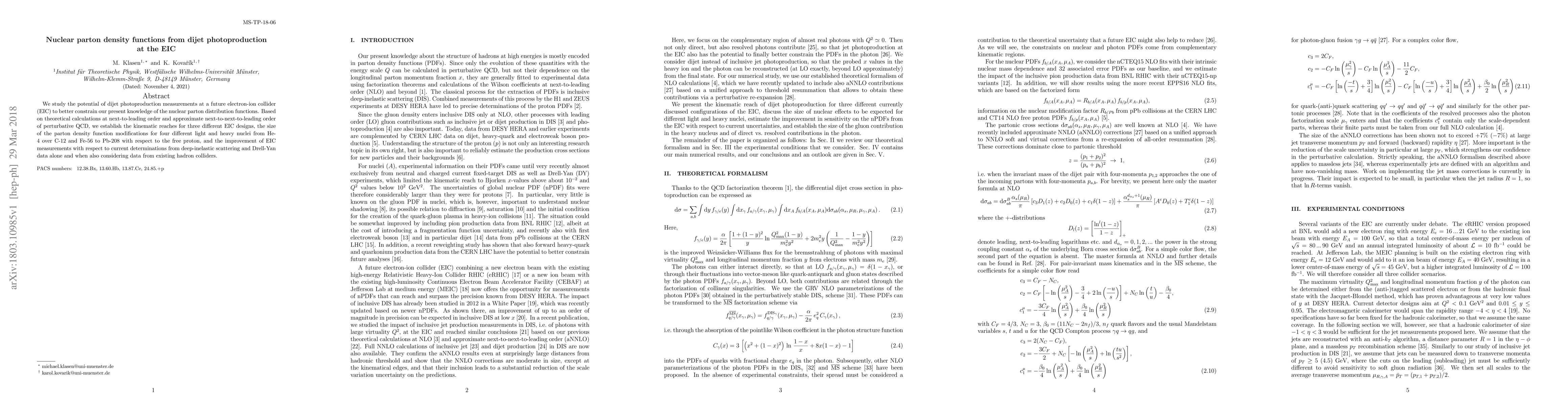 We study the potential of dijet photoproduction measurements at a future electron-ion collider (EIC) to better constrain our present knowledge of the nuclear parton distribution functions. Based on theoretical calculations at next-to-leading order and approximate next-to-next-to-leading order of perturbative QCD, we establish the kinematic reaches for three different EIC designs, the size of the parton density function modifications for four different light and heavy nuclei from He-4 over C-12 and Fe-56 to Pb-208 with respect to the free proton, and the improvement of EIC measurements with respect to current determinations from deep-inelastic scattering and Drell-Yan data alone and when also considering data from existing hadron colliders.