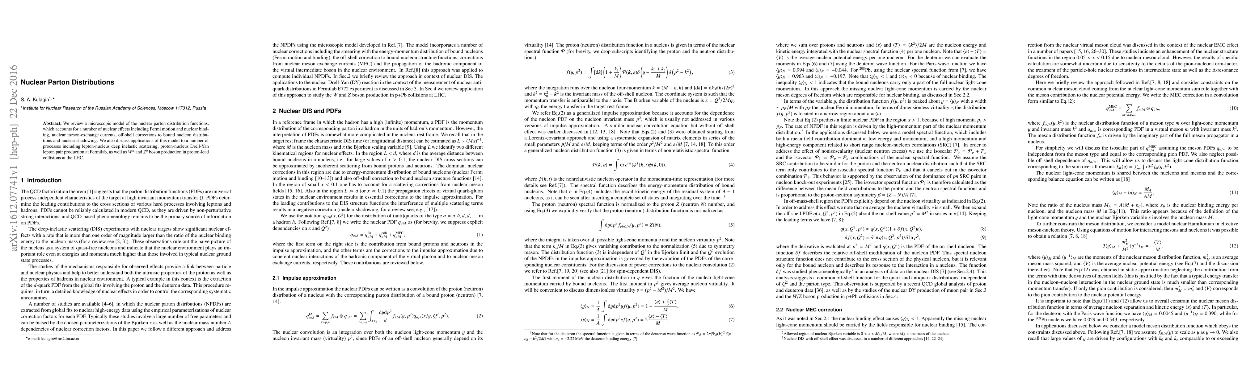 This paper reviews a microscopic model for nuclear parton distribution functions, incorporating nuclear effects like Fermi motion and shadowing, and applies it to processes such as lepton-nucleus scattering and proton-lead collisions at the LHC.