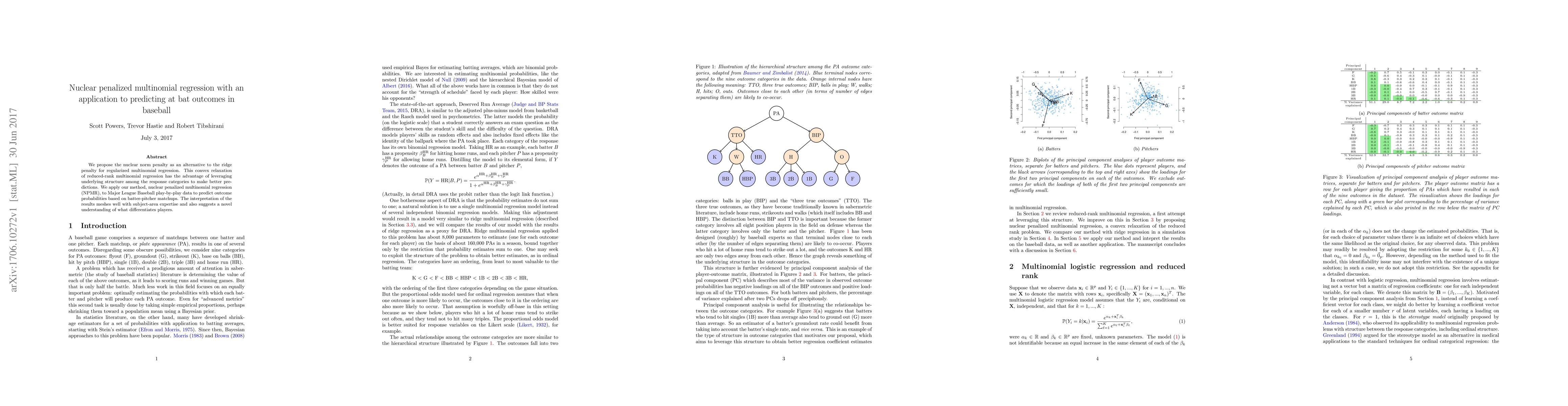 We propose the nuclear norm penalty as an alternative to the ridge penalty for regularized multinomial regression. This convex relaxation of reduced-rank multinomial regression has the advantage of leveraging underlying structure among the response categories to make better predictions. We apply our method, nuclear penalized multinomial regression (NPMR), to Major League Baseball play-by-play data to predict outcome probabilities based on batter-pitcher matchups. The interpretation of the results meshes well with subject-area expertise and also suggests a novel understanding of what differentiates players.
