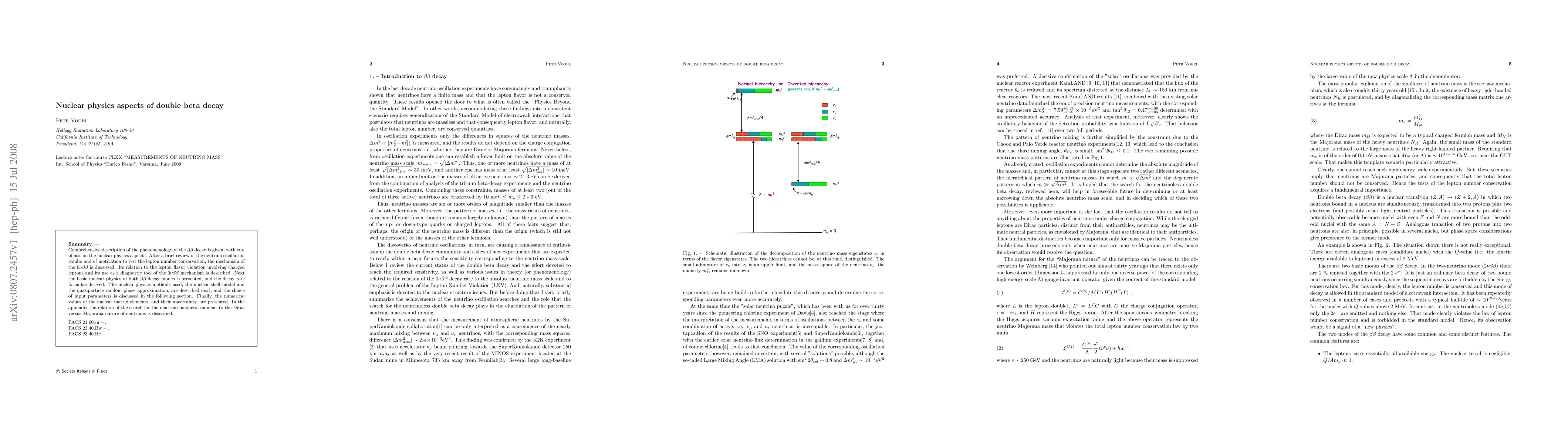 This paper provides a detailed examination of the nuclear physics aspects of double beta decay, focusing on the $0\nu\beta\beta$ mechanism and its implications for lepton number conservation. It discusses the nuclear shell model and quasiparticle random phase approximation methods, derives decay rate formulae, and presents numerical values for nuclear matrix elements, alongside their uncertainties.
