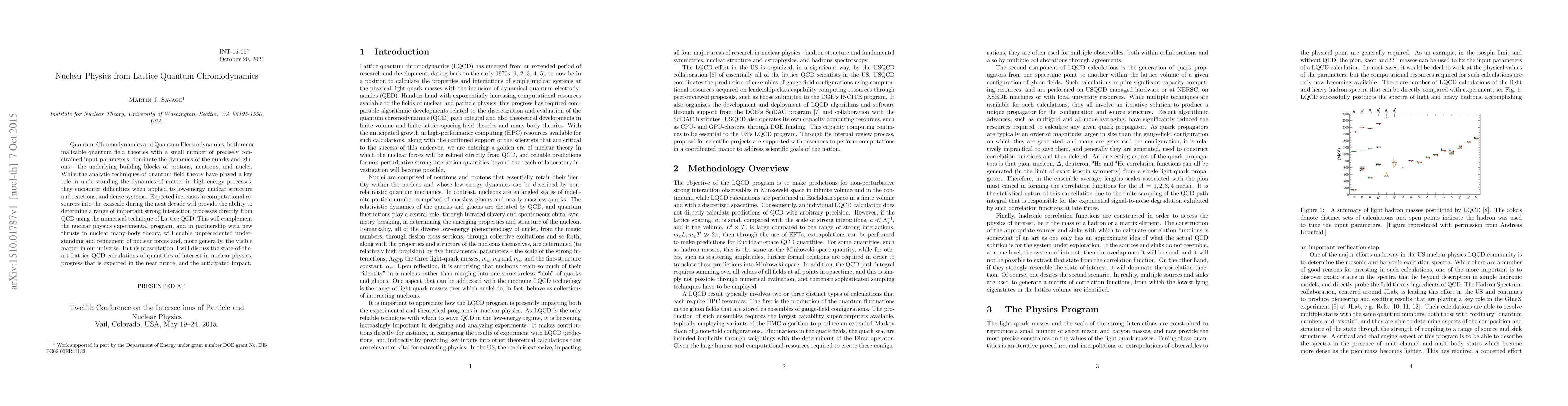 This paper discusses the application of Lattice Quantum Chromodynamics (QCD) to nuclear physics, highlighting its potential to determine strong interaction processes directly from QCD using numerical techniques. It emphasizes the expected advancements in computational resources and the anticipated impact on understanding nuclear forces and the structure of visible matter.