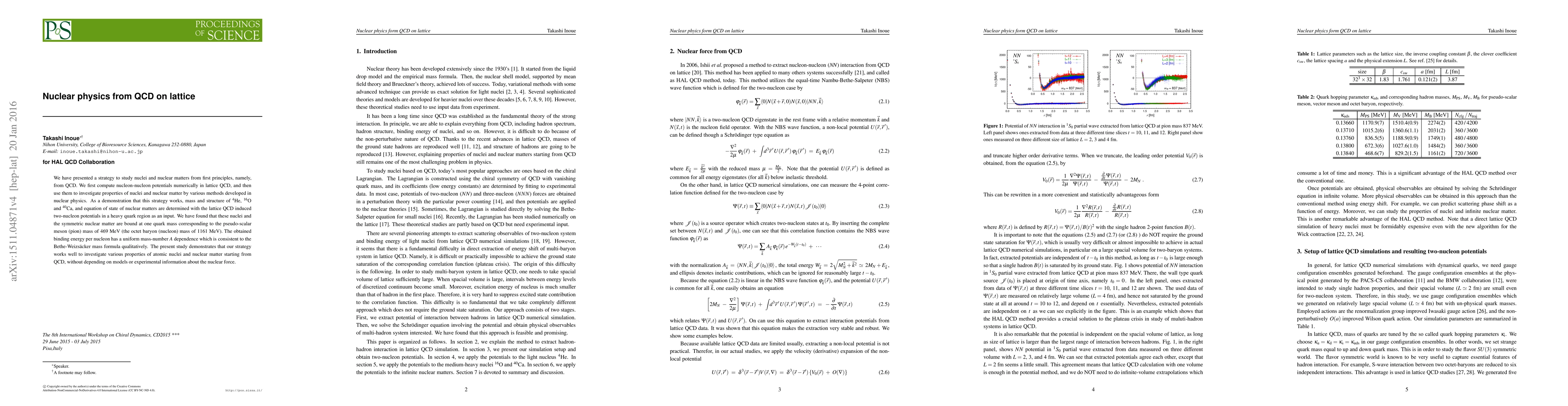 We have presented a strategy to study nuclei and nuclear matters from first principles, namely, from QCD. We first compute nucleon-nucleon potentials numerically in lattice QCD, and then use them to investigate properties of nuclei and nuclear matter by various methods developed in nuclear physics. As a demonstration that this strategy works, mass and structure of ^4^He, ^16^O and ^40^Ca, and equation of state of nuclear matters are determined with the lattice QCD induced two-nucleon potentials in a heavy quark region as an input. We have found that these nuclei and the symmetric nuclear matter are bound at one quark mass corresponding to the pseudo-scalar meson (pion) mass of 469 MeV (the octet baryon (nucleon) mass of 1161 MeV). The obtained binding energy per nucleon has a uniform mass-number A dependence which is consistent to the Bethe-Weizsacker mass formula qualitatively. The present study demonstrates that our strategy works well to investigate various properties of atomic nuclei and nuclear matter starting from QCD, without depending on models or experimental information about the nuclear force.