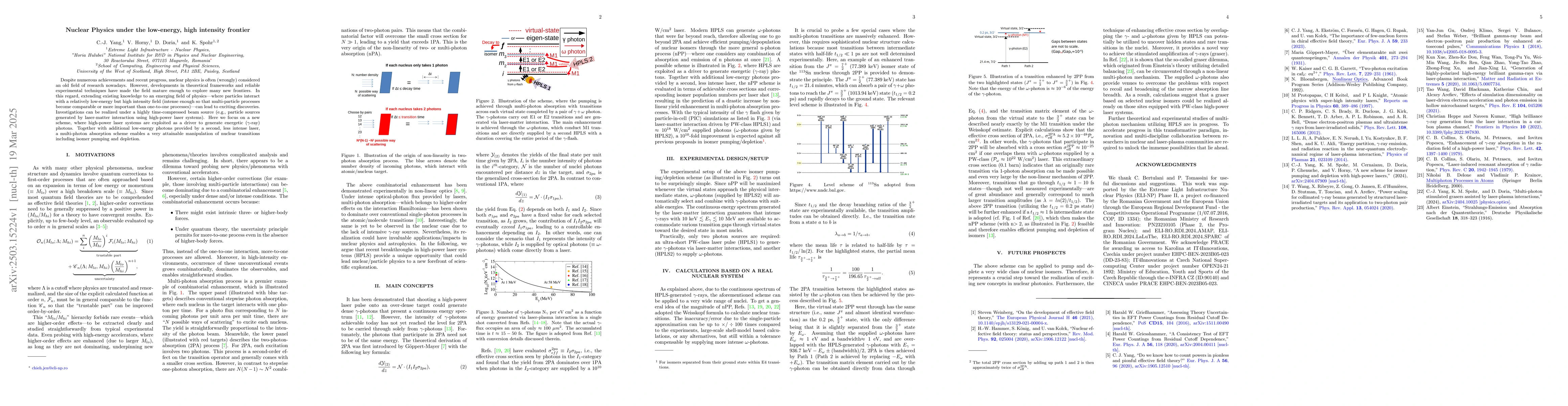 This paper explores the potential of nuclear physics under the low-energy, high-intensity frontier, emphasizing the use of high-power laser systems to generate energetic photons for nuclear transition manipulation. It proposes a multi-photon absorption scheme combining high-energy and low-energy photons to achieve isomer pumping and depletion, highlighting new research opportunities in this emerging field.
