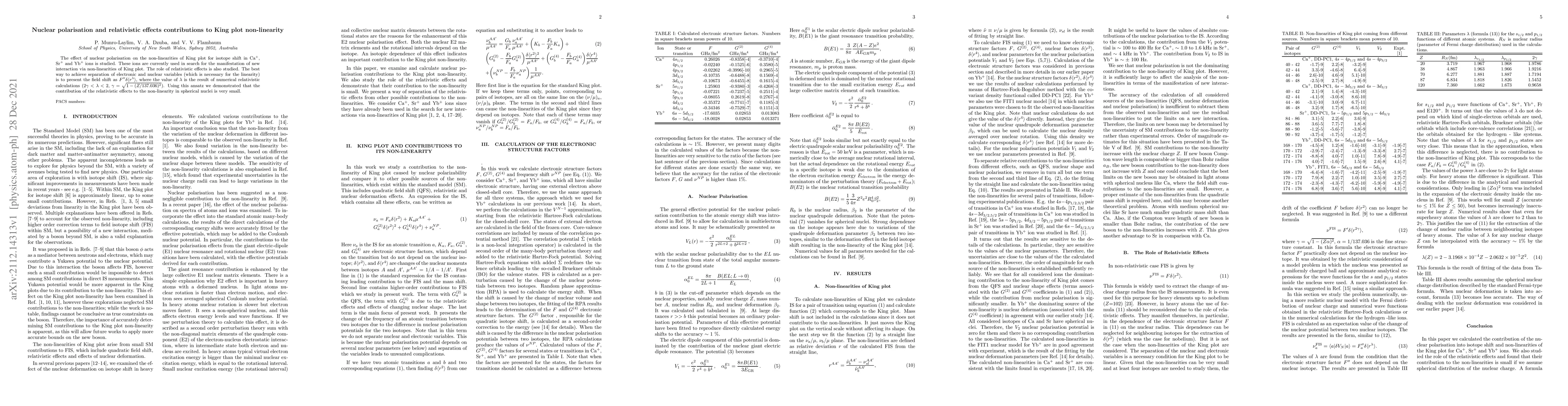 This paper investigates nuclear polarisation and relativistic effects on the non-linearities of King plots for isotope shifts in Ca$^+$, Sr$^+$, and Yb$^+$ ions, which are used to search for new interactions. It finds that relativistic effects contribute minimally to the non-linearity in spherical nuclei.