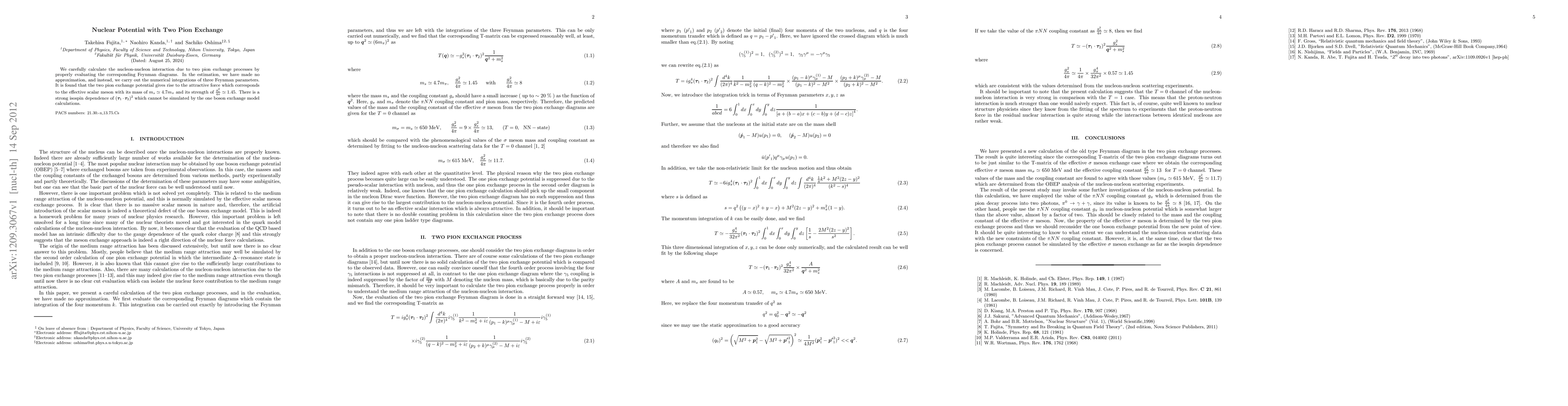 We carefully calculate the nucleon-nucleon interaction due to two pion exchange processes by properly evaluating the corresponding Feynman diagrams. In the estimation, we have made no approximation, and instead, we carry out the numerical integrations of three Feynman parameters. It is found that the two pion exchange potential gives rise to the attractive force which corresponds to the effective scalar meson with its mass of $m_s\simeq 4.7 m_\pi$ and its strength of ${g_s^2\over 4\pi}\simeq 1.45 $. There is a strong isospin dependence of $(\bm{\tau}_1\cdot \bm{\tau}_2)^2 $ which cannot be simulated by the one boson exchange model calculations.
