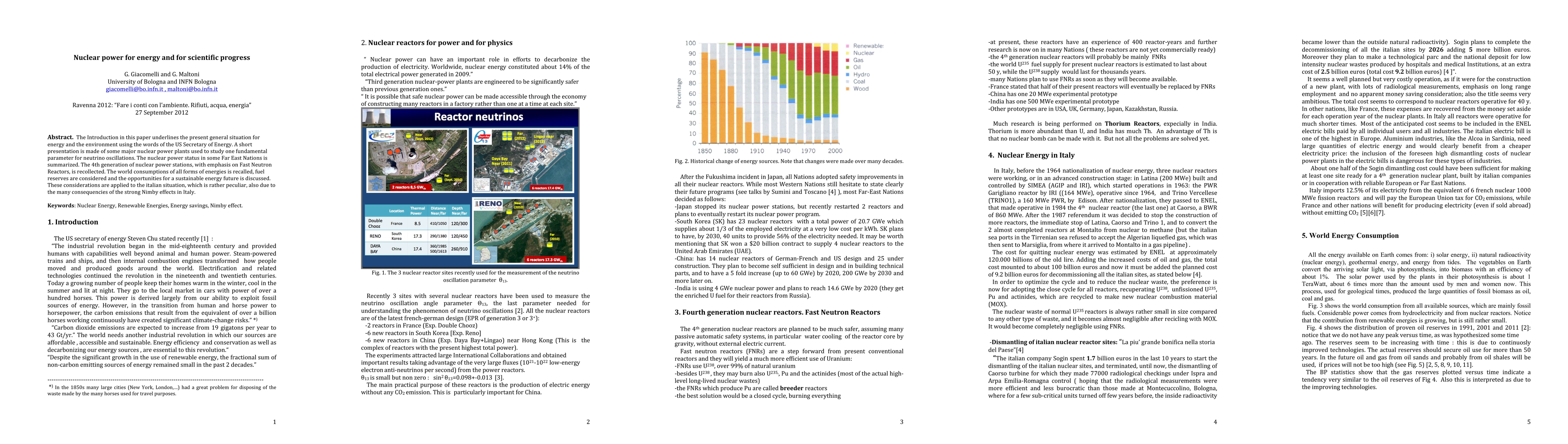 The Introduction in this paper underlines the present general situation for energy and the environment using the words of the US Secretary of Energy. A short presentation is made of some major nuclear power plants used to study one fundamental parameter for neutrino oscillations. The nuclear power status in some Far East Nations is summarized. The 4th generation of nuclear power stations, with emphasis on Fast Neutron Reactors, is recollected. The world consumptions of all forms of energies is recalled, fuel reserves are considered and the opportunities for a sustainable energy future is discussed. These considerations are applied to the italian situation, which is rather peculiar, also due to the many consequencies of the strong Nimby effects in Italy.