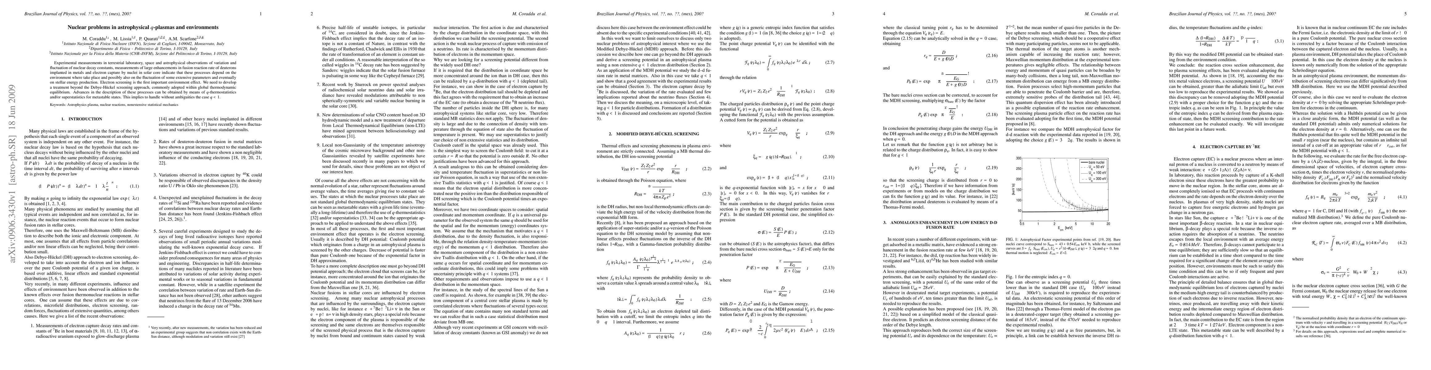 Experimental measurements in terrestrial laboratory, space and astrophysical observations of variation and fluctuation of nuclear decay constants, measurements of large enhancements in fusion reaction rate of deuterons implanted in metals and electron capture by nuclei in solar core indicate that these processes depend on the environment where take place and possibly also on the fluctuation of some extensive parameters and eventually on stellar energy production. Electron screening is the first important environment effect. We need to develop a treatment beyond the Debye-Huckel screening approach, commonly adopted within global thermodynamic equilibrium. Advances in the description of these processes can be obtained by means of q-thermostatistics and/or superstatistics for metastable states. This implies to handle without ambiguities the case q<1.