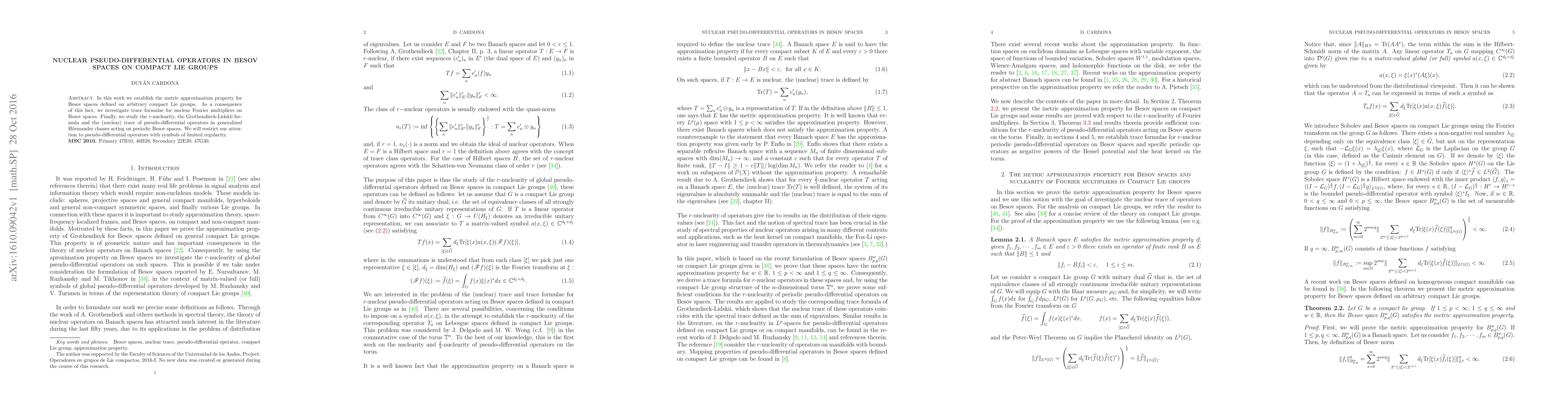 This research establishes the metric approximation property for Besov spaces on compact Lie groups and explores trace formulae for nuclear Fourier multipliers. It further examines the r-nuclearity, Grothendieck-Lidskii formula, and the trace of pseudo-differential operators in generalized Hörmander classes acting on periodic Besov spaces, focusing on operators with limited regularity symbols.