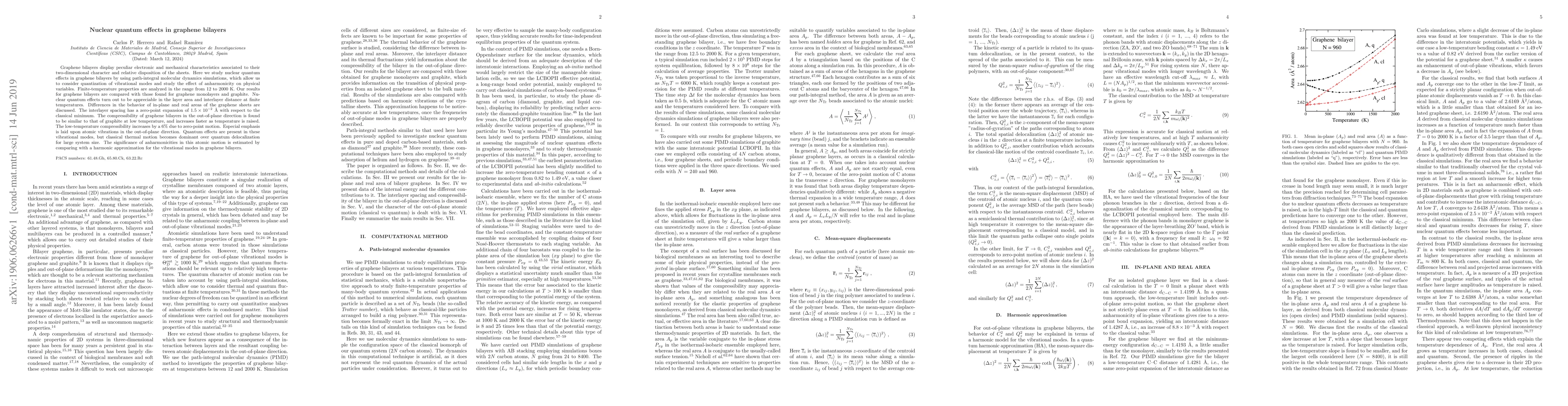 Graphene bilayers display peculiar electronic and mechanical characteristics associated to their two-dimensional character and relative disposition of the sheets. Here we study nuclear quantum effects in graphene bilayers by using path-integral molecular dynamics simulations, which allow us to consider quantization of vibrational modes and study the effect of anharmonicity on physical variables. Finite-temperature properties are analyzed in the range from 12 to 2000~K. Our results for graphene bilayers are compared with those found for graphene monolayers and graphite. Nuclear quantum effects turn out to be appreciable in the layer area and interlayer distance at finite temperatures. Differences in the behavior of in-plane and real areas of the graphene sheets are discussed. The interlayer spacing has a zero-point expansion of $1.5 \times 10^{-2}$ \AA\ with respect to the classical minimum. The compressibility of graphene bilayers in the out-of-plane direction is found to be similar to that of graphite at low temperature, and increases faster as temperature is raised. The low-temperature compressibility increases by a 6\% due to zero-point motion. Especial emphasis is laid upon atomic vibrations in the out-of-plane direction. Quantum effects are present in these vibrational modes, but classical thermal motion becomes dominant over quantum delocalization for large system size. The significance of anharmonicities in this atomic motion is estimated by comparing with a harmonic approximation for the vibrational modes in graphene bilayers.