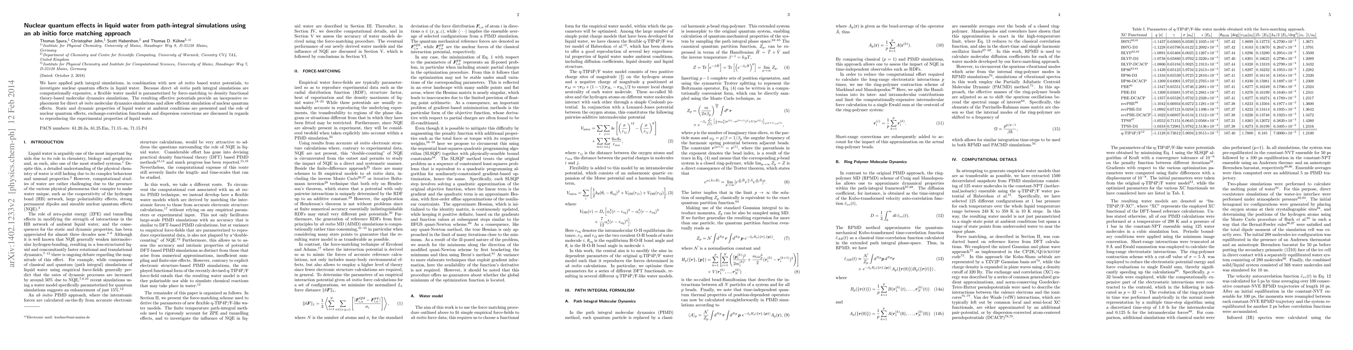 This study employs path integral simulations with ab initio force-matched water models to investigate nuclear quantum effects in liquid water, offering a cost-effective alternative to direct ab initio simulations. The research discusses the influence of nuclear quantum effects, exchange-correlation functionals, and dispersion corrections on the properties of liquid water.