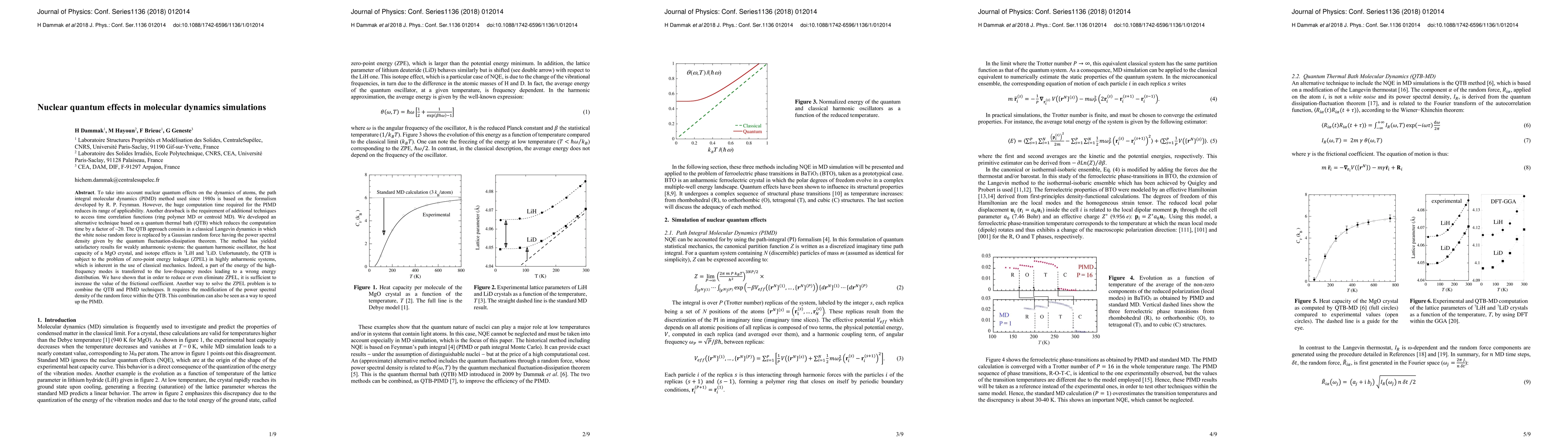 To take into account nuclear quantum effects on the dynamics of atoms, the path integral molecular dynamics (PIMD) method used since 1980s is based on the formalism developed by R. P. Feynman. However, the huge computation time required for the PIMD reduces its range of applicability. Another drawback is the requirement of additional techniques to access time correlation functions (ring polymer MD or centroid MD). We developed an alternative technique based on a quantum thermal bath (QTB) which reduces the computation time by a factor of ~20. The QTB approach consists in a classical Langevin dynamics in which the white noise random force is replaced by a Gaussian random force having the power spectral density given by the quantum fluctuation-dissipation theorem. The method has yielded satisfactory results for weakly anharmonic systems: the quantum harmonic oscillator, the heat capacity of a MgO crystal, and isotope effects in 7 LiH and 7 LiD. Unfortunately, the QTB is subject to the problem of zero-point energy leakage (ZPEL) in highly anharmonic systems, which is inherent in the use of classical mechanics. Indeed, a part of the energy of the high-frequency modes is transferred to the low-frequency modes leading to a wrong energy distribution. We have shown that in order to reduce or even eliminate ZPEL, it is sufficient to increase the value of the frictional coefficient. Another way to solve the ZPEL problem is to combine the QTB and PIMD techniques. It requires the modification of the power spectral density of the random force within the QTB. This combination can also be seen as a way to speed up the PIMD.