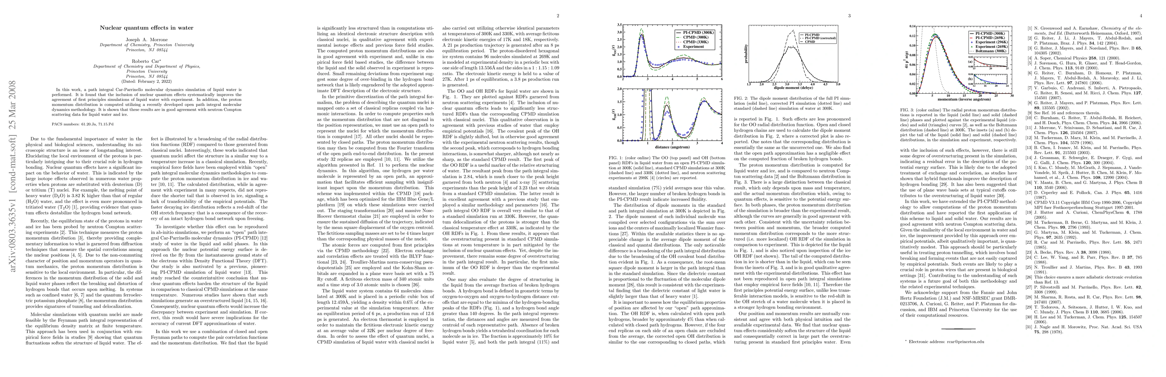 This study employs path integral Car-Parrinello molecular dynamics to simulate liquid water, revealing that nuclear quantum effects enhance the accuracy of first principles simulations compared to experimental data. The proton momentum distribution, computed using a novel open path integral method, aligns well with neutron Compton scattering data for both liquid water and ice.