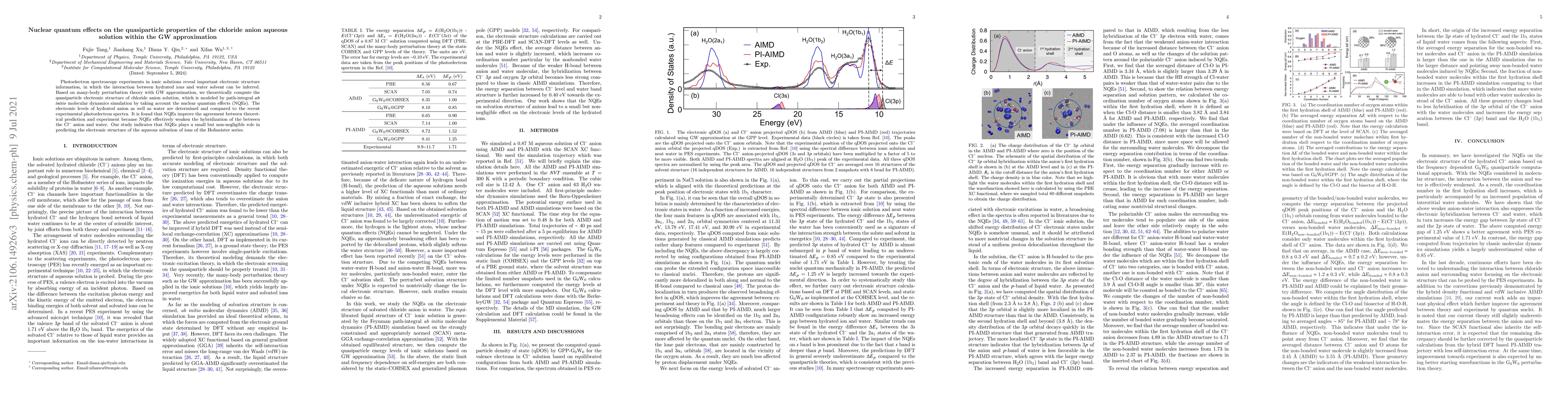 Photoelectron spectroscopy experiments in ionic solutions reveal important electronic structure information, in which the interaction between hydrated ions and water solvent can be inferred. Based on many-body perturbation theory with GW approximation, we theoretically compute the quasiparticle electronic structure of chloride anion solution, which is modeled by path-integral $ab$ $initio$ molecular dynamics simulation by taking account the nuclear quantum effects (NQEs). The electronic levels of hydrated anion as well as water are determined and compared to the recent experimental photoelectron spectra. It is found that NQEs improve the agreement between theoretical prediction and experiment because NQEs effectively weaken the hybridization of the between the $\rm Cl^-$ anion and water. Our study indicates that NQEs plays a small but non-negligible role in predicting the electronic structure of the aqueous solvation of ions of the Hofmeister series.