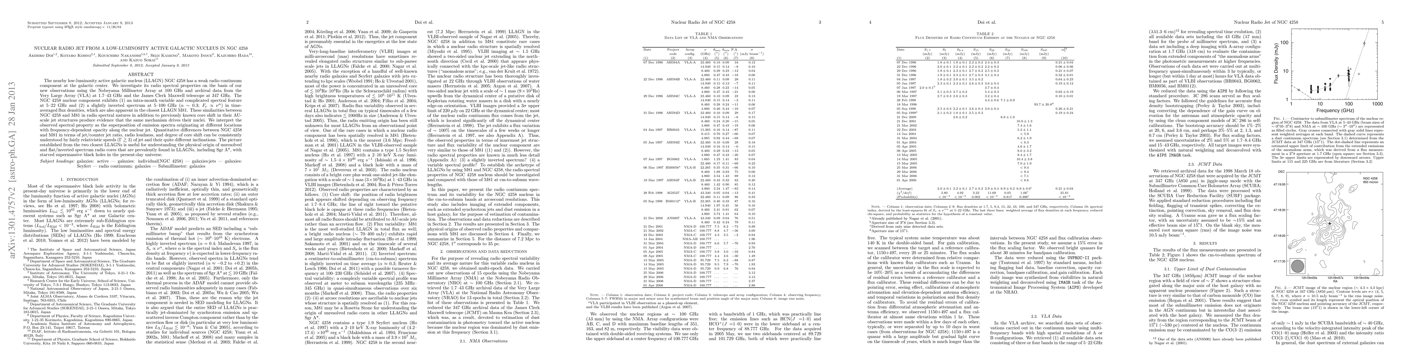 This paper investigates the radio spectral properties of the low-luminosity active galactic nucleus NGC 4258, revealing intra-month variability and a slightly inverted spectrum indicative of a nuclear jet. Comparisons with another LLAGN, M81, suggest similar mechanisms driving their nuclei, highlighting the role of relativistic jets and their varying inclinations.