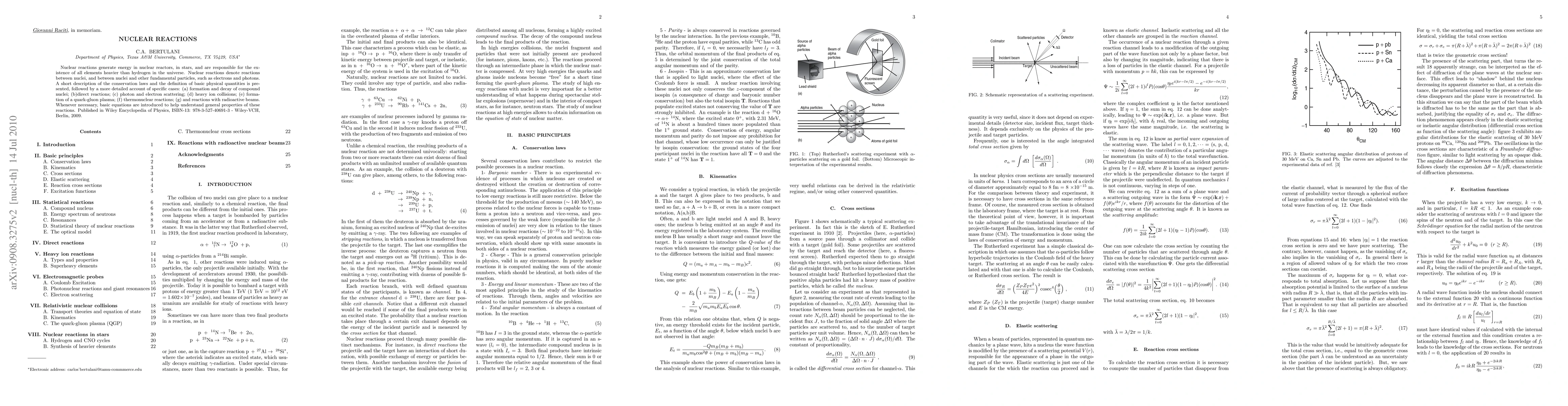 The paper provides a comprehensive overview of nuclear reactions, covering conservation laws, specific reaction types, and fundamental equations. It discusses various reaction mechanisms, including elastic scattering, direct reactions, photon and electron scattering, heavy ion collisions, quark-gluon plasma formation, thermonuclear reactions, and reactions with radioactive beams.