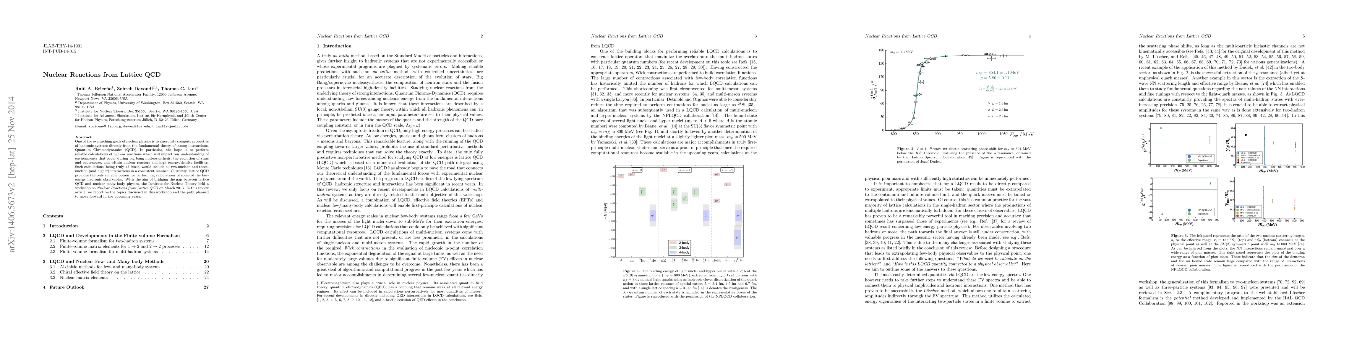 One of the overarching goals of nuclear physics is to rigorously compute properties of hadronic systems directly from the fundamental theory of strong interactions, Quantum Chromodynamics (QCD). In particular, the hope is to perform reliable calculations of nuclear reactions which will impact our understanding of environments that occur during big bang nucleosynthesis, the evolution of stars and supernovae, and within nuclear reactors and high energy/density facilities. Such calculations, being truly ab initio, would include all two-nucleon and three- nucleon (and higher) interactions in a consistent manner. Currently, lattice QCD provides the only reliable option for performing calculations of some of the low- energy hadronic observables. With the aim of bridging the gap between lattice QCD and nuclear many-body physics, the Institute for Nuclear Theory held a workshop on Nuclear Reactions from Lattice QCD on March 2013. In this review article, we report on the topics discussed in this workshop and the path planned to move forward in the upcoming years.