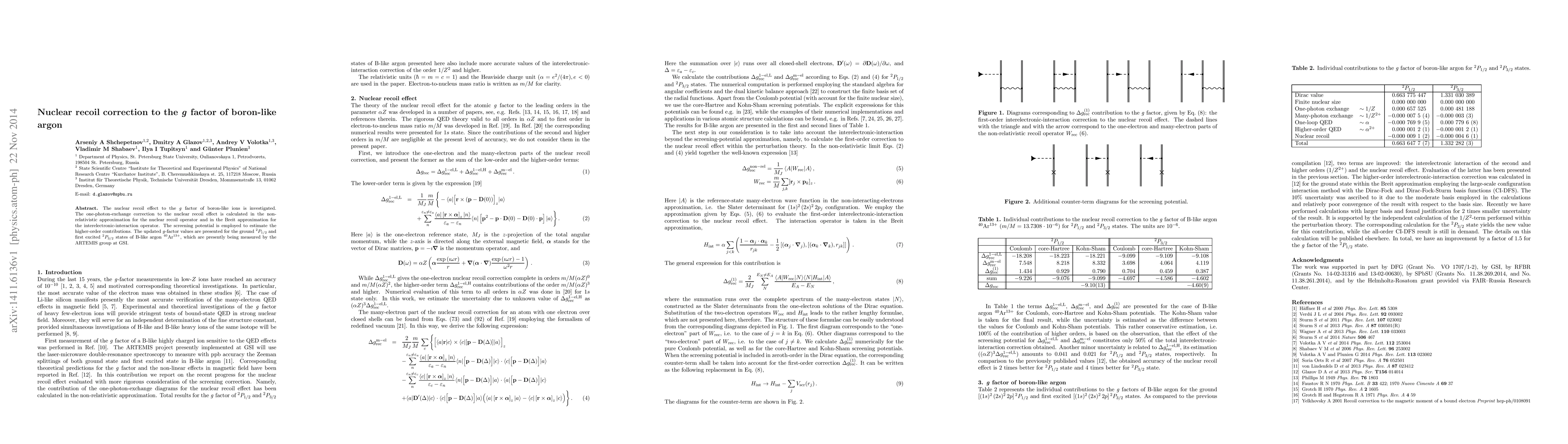This paper investigates the nuclear recoil correction to the g factor of boron-like argon ions, calculating the one-photon-exchange correction in non-relativistic and Breit approximations. Updated g-factor values for the ground and first excited states of 40^Ar^13+ are provided, relevant for current measurements by the ARTEMIS group.