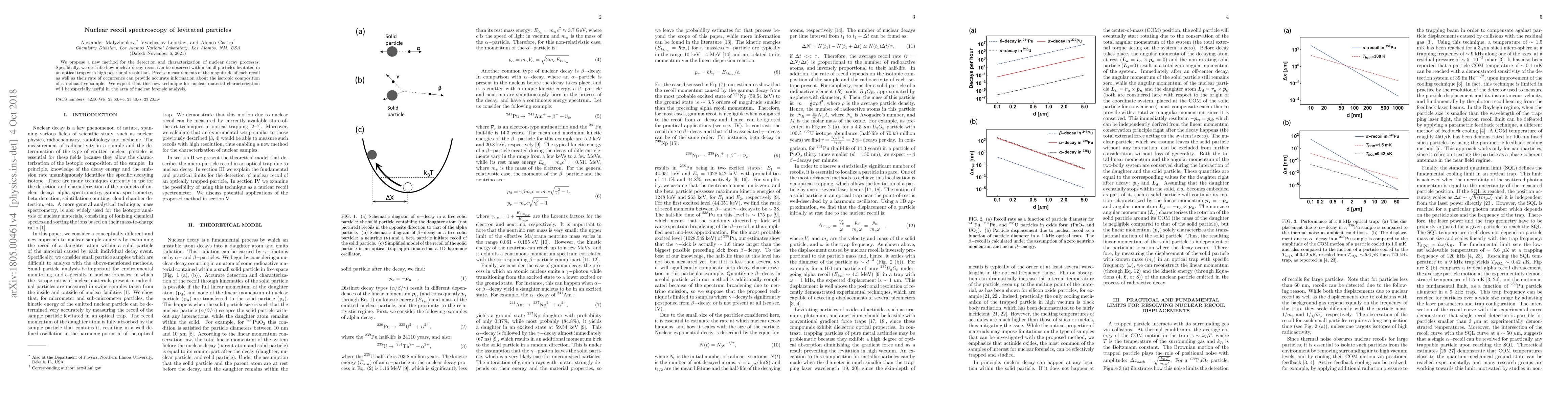 This paper proposes a novel method for detecting nuclear decay processes by observing nuclear recoil in levitated particles trapped in an optical trap, offering high positional resolution. This technique can accurately determine isotopic composition, with significant applications in nuclear forensic analysis.