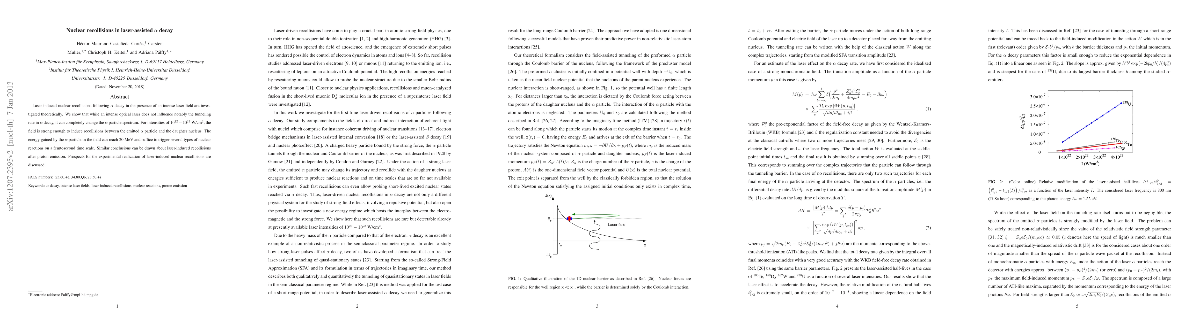 Laser-induced nuclear recollisions following $\alpha$ decay in the presence of an intense laser field are investigated theoretically. We show that while an intense optical laser does not influence notably the tunneling rate in $\alpha$ decay, it can completely change the $\alpha$ particle spectrum. For intensities of $10^{22}-10^{23}$ W/cm$^{2}$, the field is strong enough to induce recollisions between the emitted $\alpha$ particle and the daughter nucleus. The energy gained by the $\alpha$ particle in the field can reach 20 MeV and suffice to trigger several types of nuclear reactions on a femtosecond time scale. Similar conclusions can be drawn about laser-induced recollisions after proton emission. Prospects for the experimental realization of laser-induced nuclear recollisions are discussed.