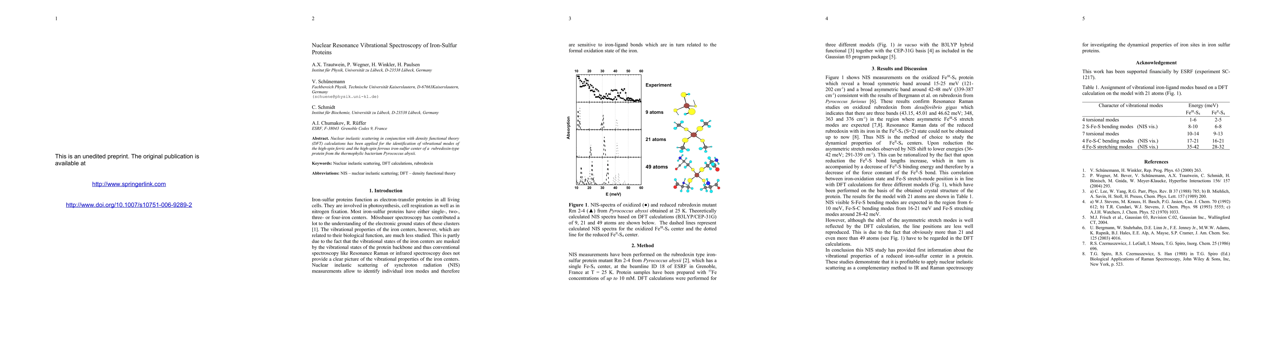 Nuclear inelastic scattering in conjunction with density functional theory (DFT) calculations has been applied for the identification of vibrational modes of the high-spin ferric and the high-spin ferrous iron-sulfur center of a rubredoxin-type protein from the thermophylic bacterium Pyrococcus abysii.