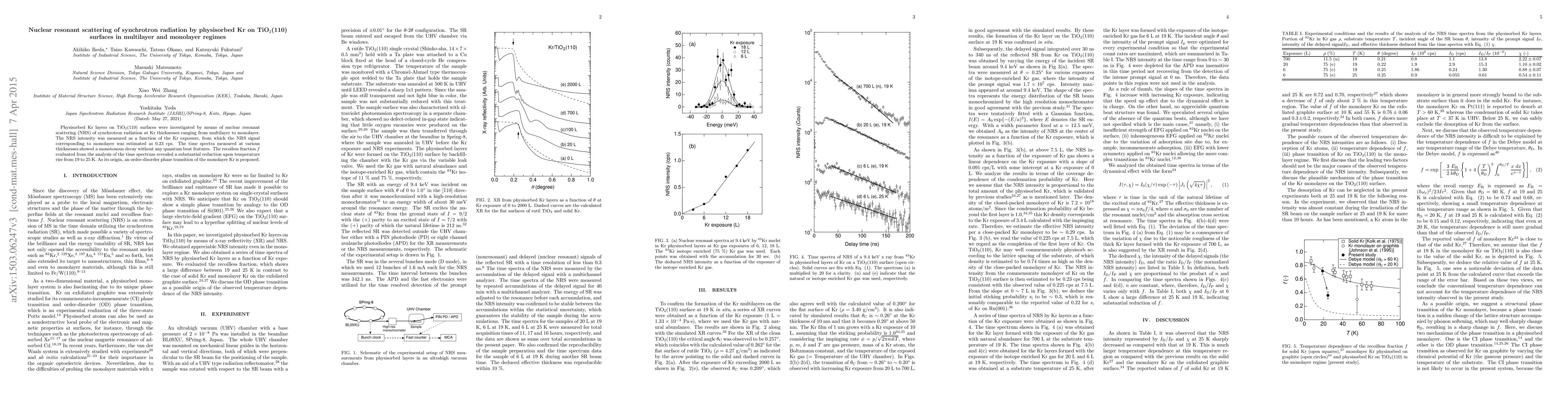 This study investigates physisorbed Kr layers on TiO$_{2}$(110) surfaces using nuclear resonant scattering (NRS) of synchrotron radiation. The NRS signal for monolayer Kr was estimated at 0.23 cps, and no quantum beat features were observed in the time spectra, suggesting an order-disorder phase transition in Kr monolayer upon temperature increase from 19 to 25 K.