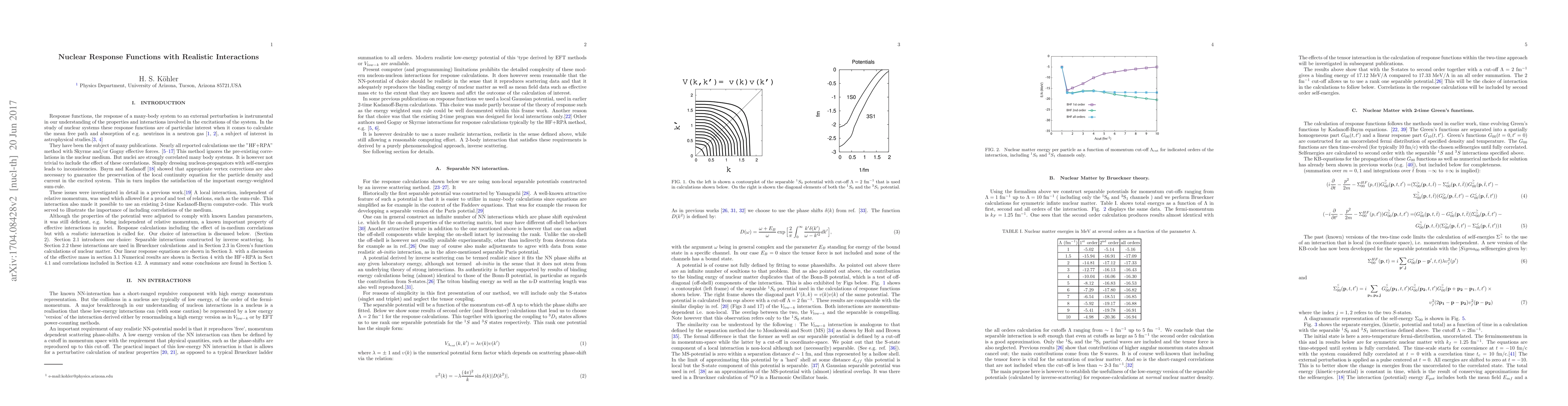 Linear density response functions are calculated for symmetric nuclear matter of normal density by time-evolving two-time Green's functions in real time. The feasability and convenience of this approach to this particular problem has been shown in previous publications. Calculations are here improved by using more 'realistic' interactions derived from phase-shifts by inverse scattering. Of particular interest is the effect of the strong correlations in the nuclear medium on the response. This as well as the related energy weighted sum rule, dependence on mean field and effective mass are some of the main objects of this investigation. Comparisons are made with the collision-less limit, the HF+RPA method. The importance of vertex corrections is demonstrated.